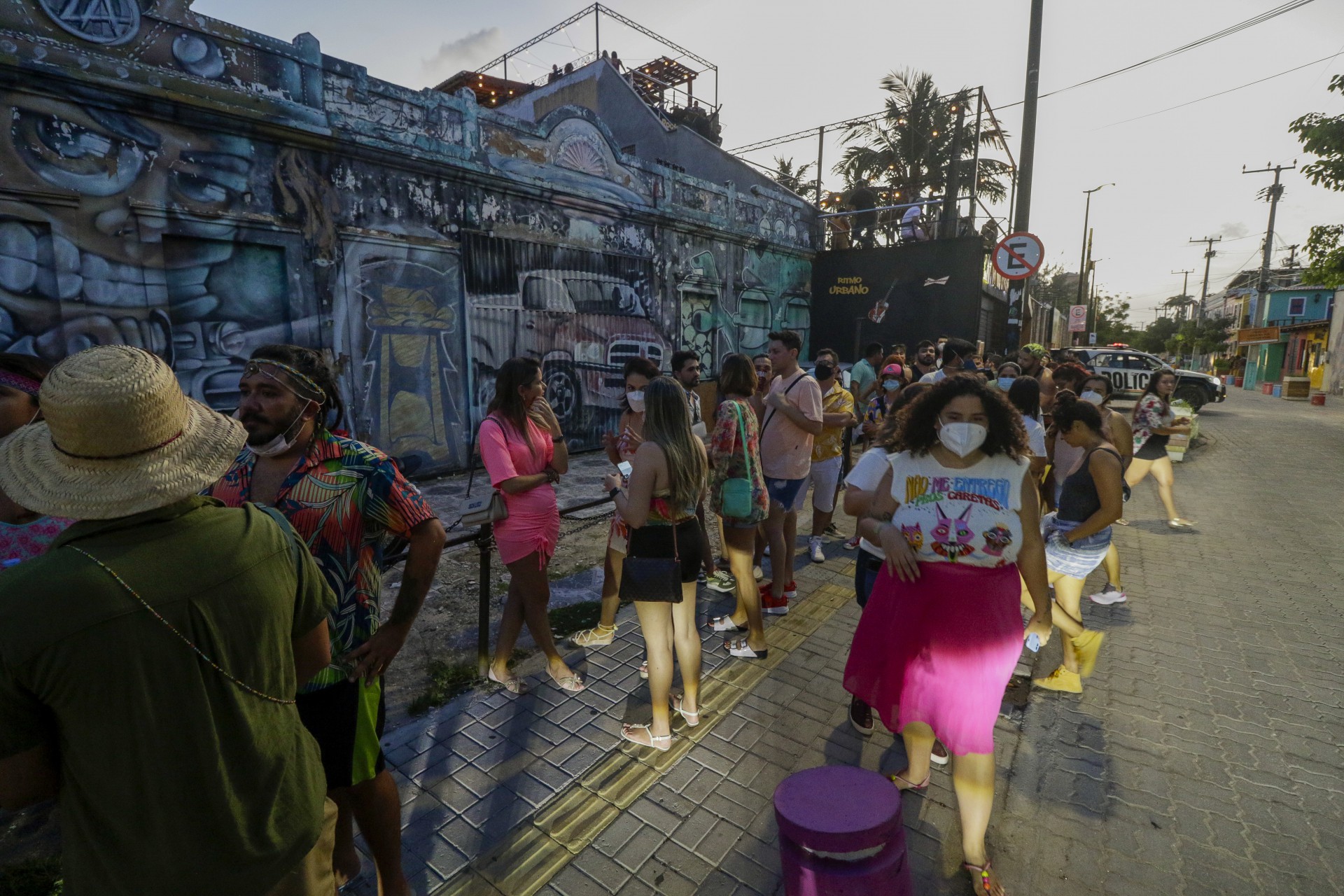 Foliões de Carnaval dançavam marchinhas na Rua dos Tabajaras, na Praia de Iracema, neste domingo, 27, a partir das 17h30min. Eles esperavam em filas para entrar em eventos privados de casas noturnas, como Jamrock e Ritmo Urbano. A reportagem registrou um movimento intenso na tradicional via festiva, diferente do que foi visto mais cedo, quando clubes e restaurantes da região ainda estavam fechados.