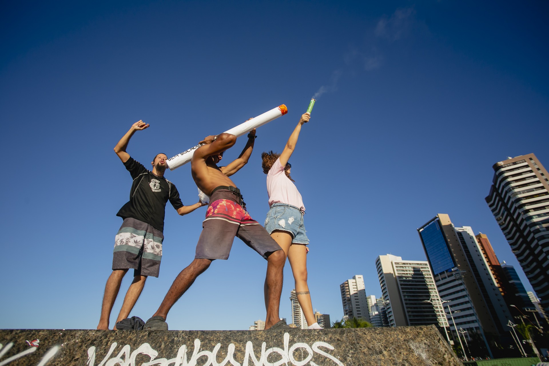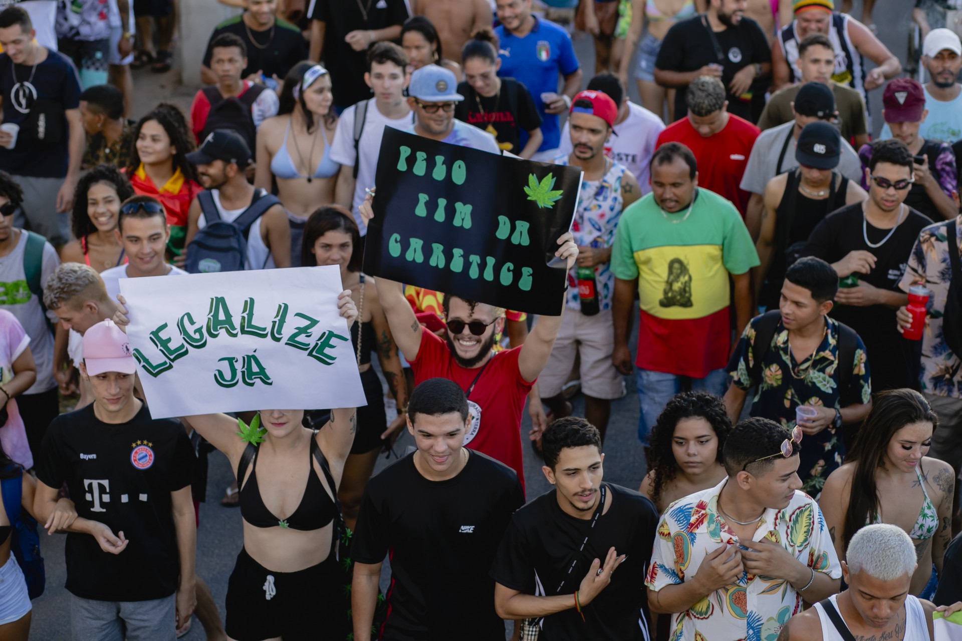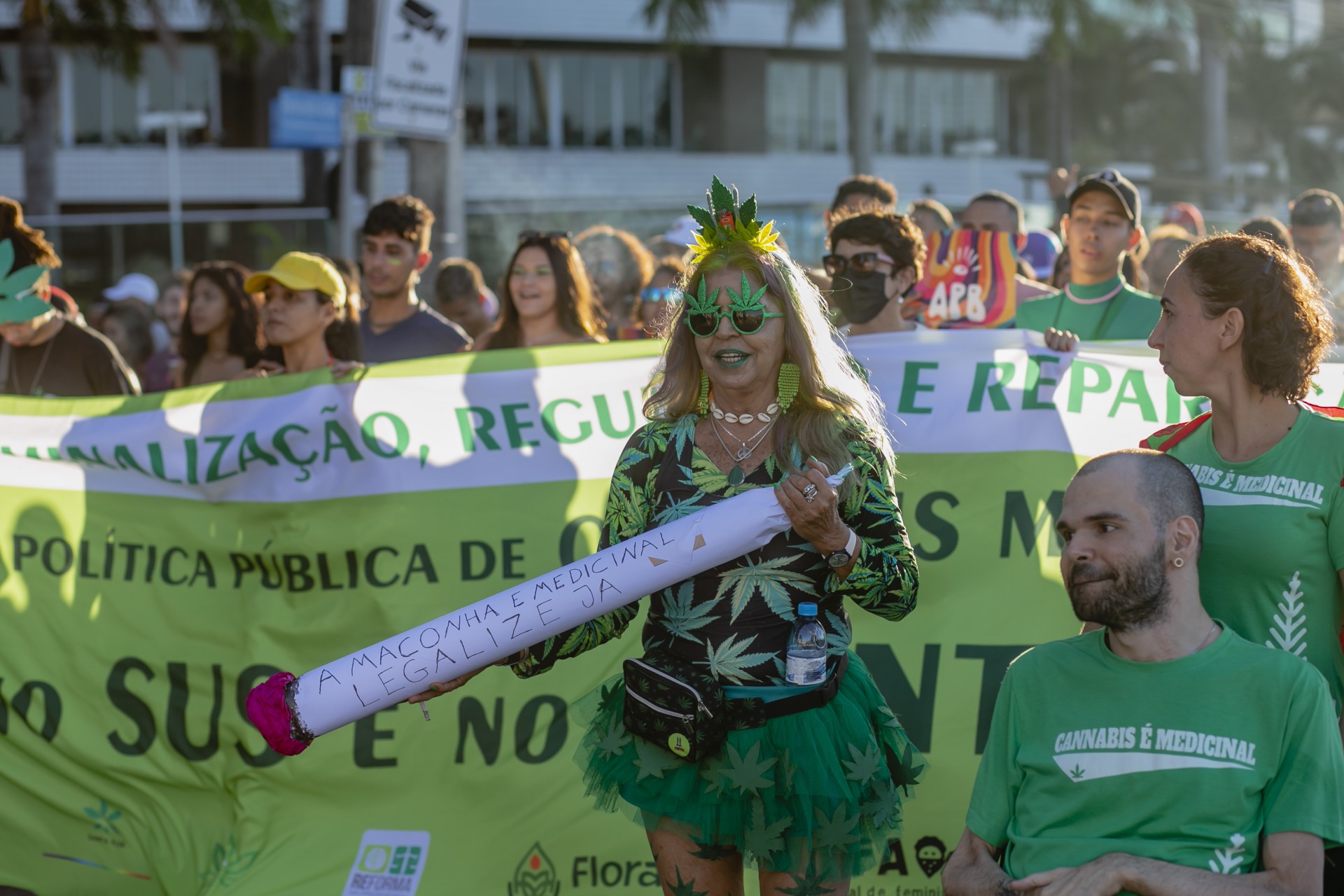 Os manifestantes também entoaram gritos contra o presidente Jair Bolsonaro. Alguns estavam fantasiados com o tema da marcha, com desenhos de folhas de maconha, e outros levaram cigarros falsos gigantes para representar o cigarro feito com a planta.