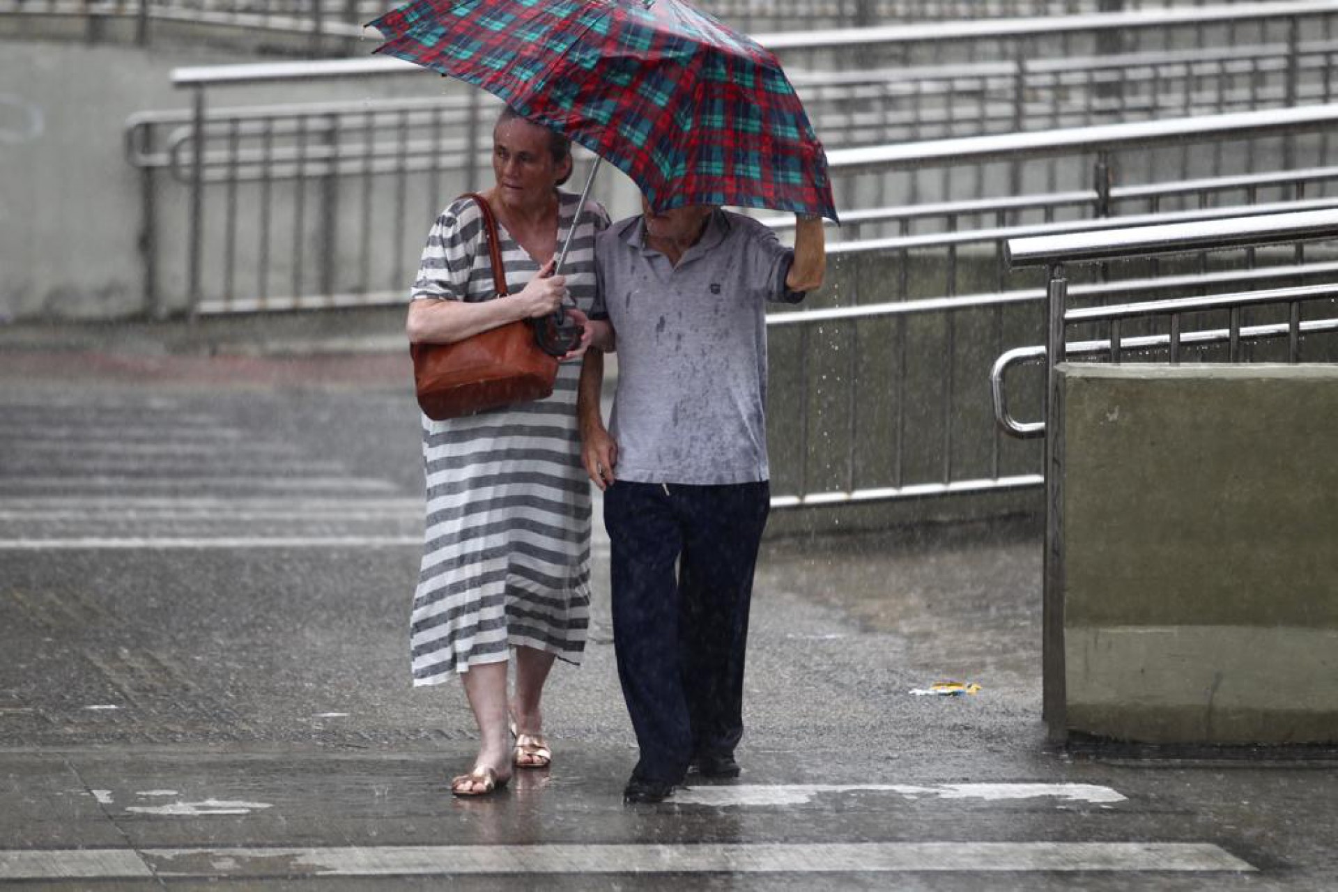 Na rua Castro e Silva, próximo à Catedral Metroplitana, pedestres precisaram caminhar em meio à via alagada, onde a água chegava à altura da canela.