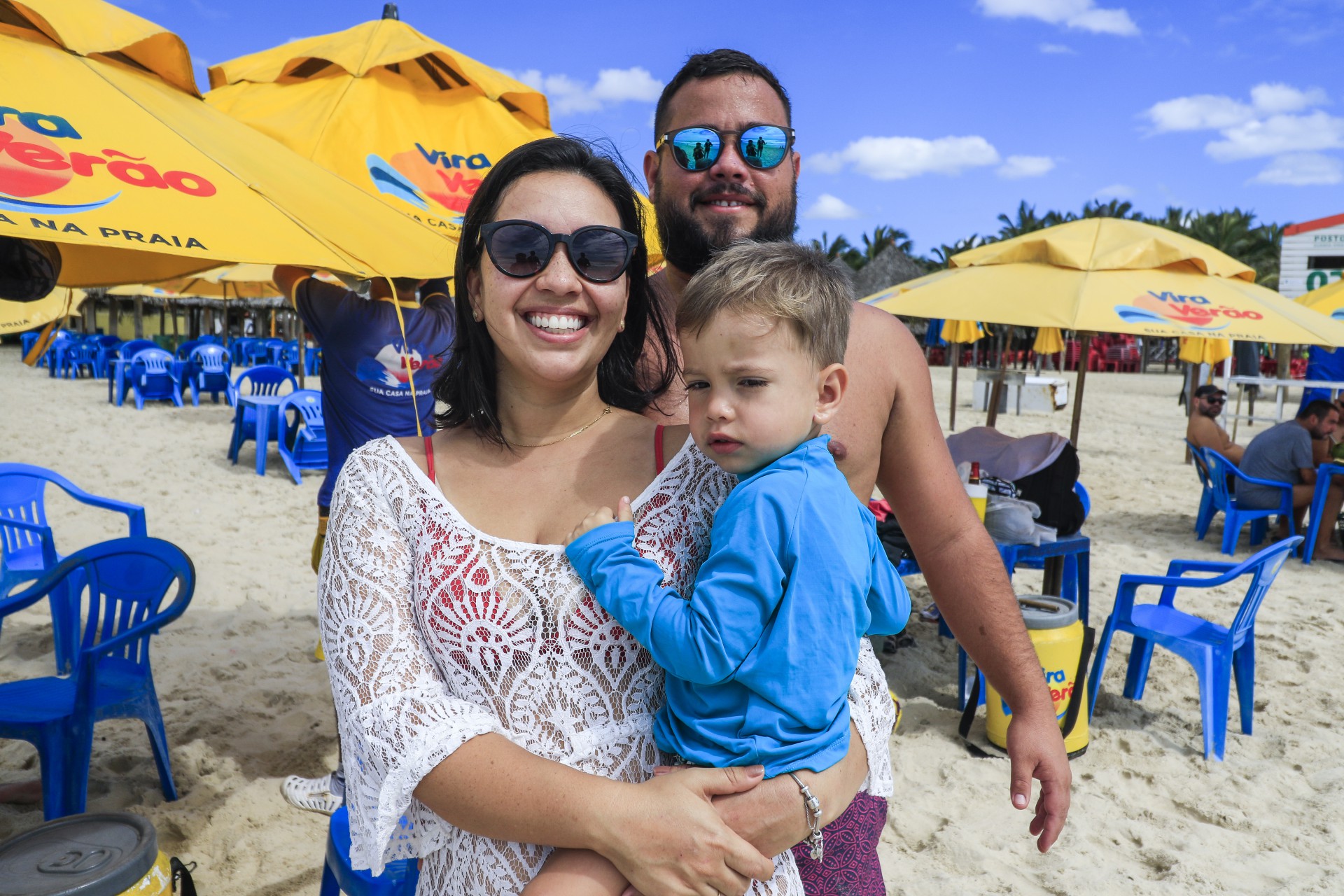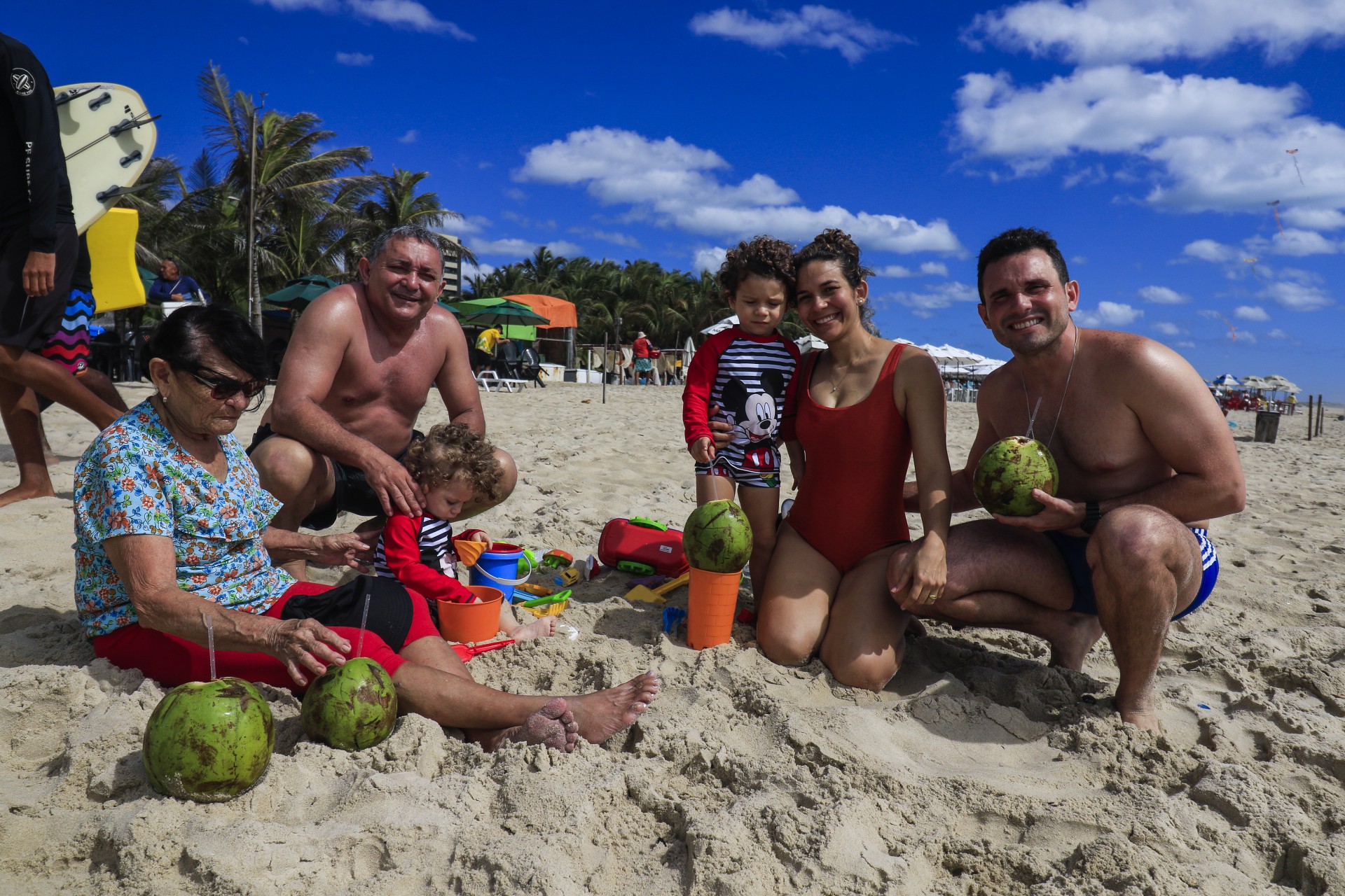 Residente em Fortaleza, Hugo Freitas levou os filhos Gabriel, 3, Samuel, 2, esposa, pai e avó para aproveitar a manhã de sol na Praia do Futuro. “Resolvi aproveitar a data de hoje para vir à praia. Chegamos agora e estamos brincando na areia, mas já já vamos dar um mergulho.”