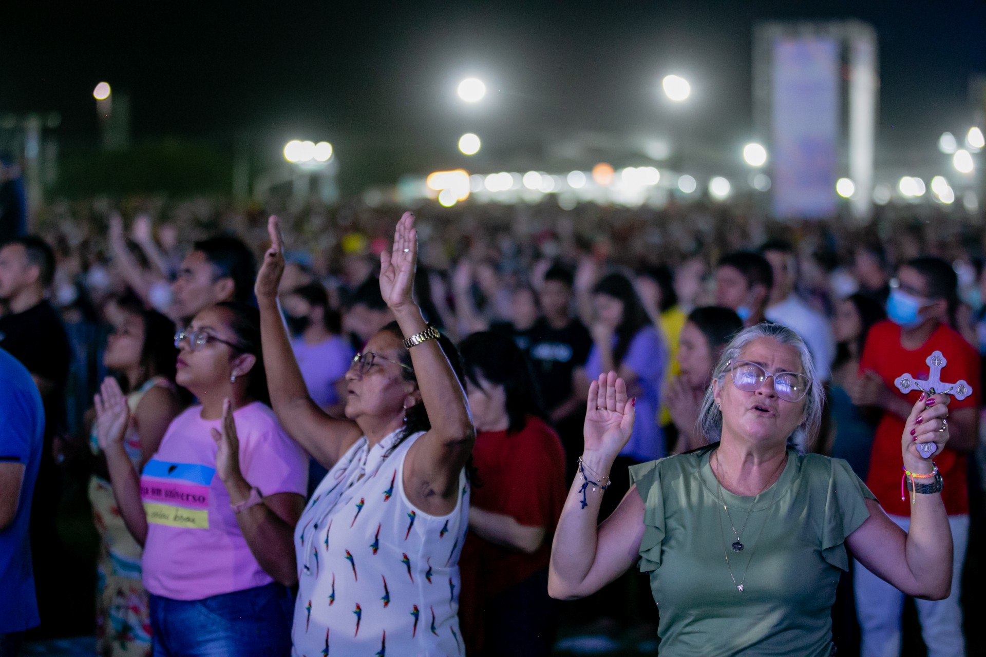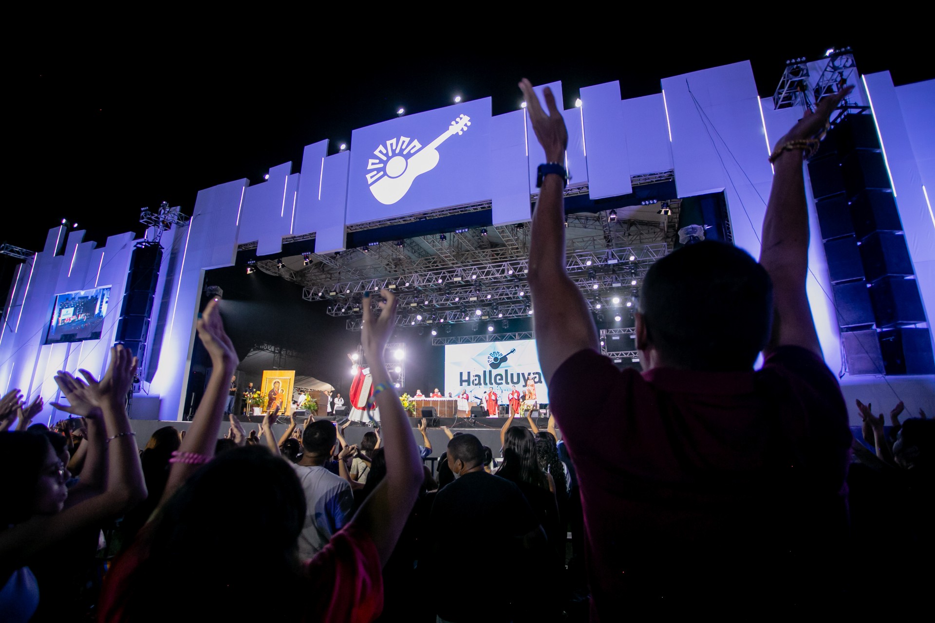 Uma multidão de fiéis lotou o pátio central do Condomínio Espiritual Uirapuru (CEU), em Fortaleza, na noite desta quarta-feira, 20, para acompanhar a missa de abertura da 24ª edição do Festival Halleluya. A celebração marcou a retomada presencial do evento religioso, após dois anos de suspensão devido às restrições da pandemia. Promovido pela Comunidade Católica Shalom, o festival reúne shows musicais, fé e solidariedade em cinco dias de programação. Neste ano, os organizadores esperam público superior a um milhão de pessoas.