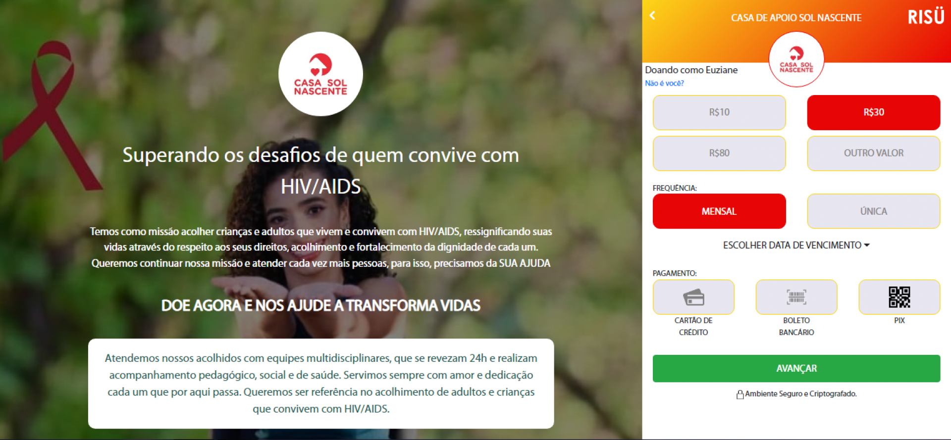 Por meio do link para a plataforma Risú, o doador poderá contribuir financeiramente com a Casa Sol Nascente.