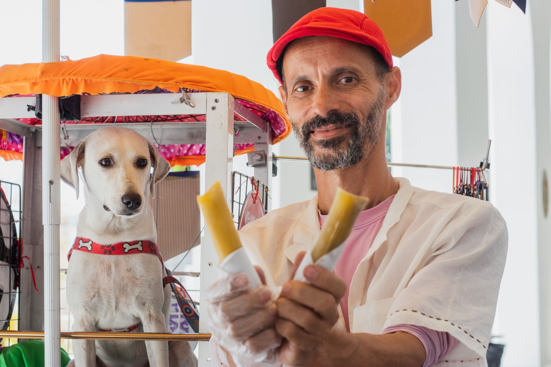 Mansa e de pelos macios, Lua é atração entre os funcionários do complexo e os clientes. Assim como o dindin vendido por Dadá: vegano, usando frutas naturais e rapadura para adoçar, custa apenas R$2,50. Na bicicleta, ele também vende artesanatos feitos em vinil, com artes e frases diversas.