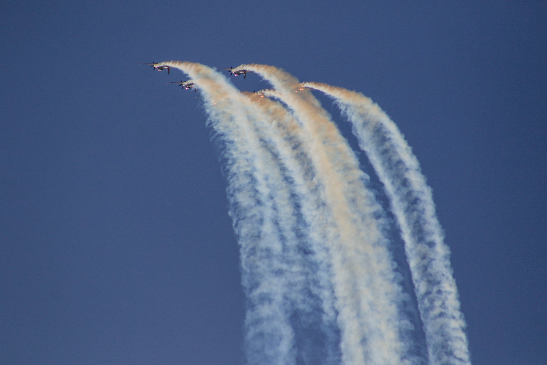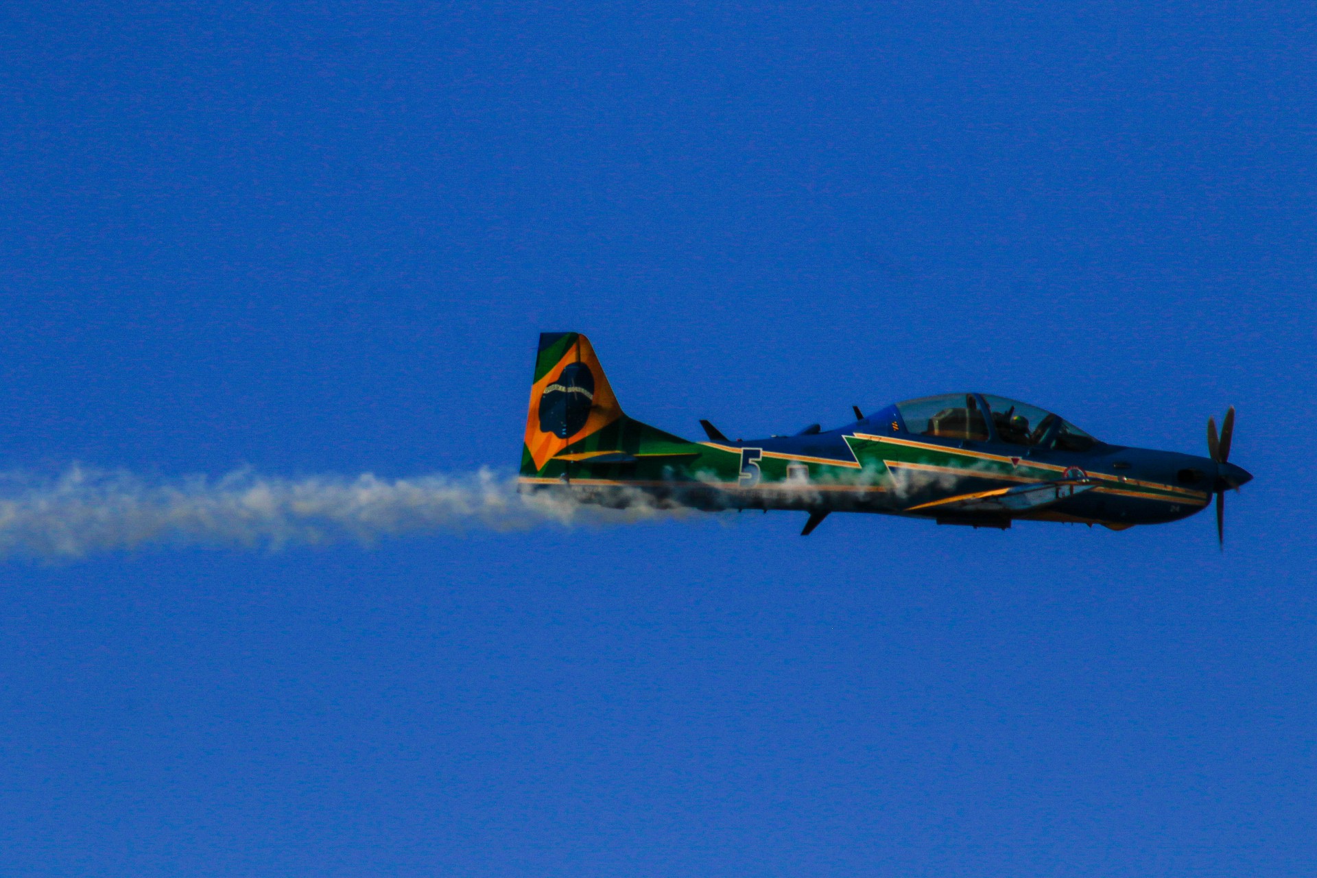 “A fumaça que sai dos aviões é produzida pela queima de óleo biodegradável. Ao ser acionado pelo piloto, o óleo entra em contato com o escapamento quente e vira fumaça”, explicou ao público entre uma formação e outra.