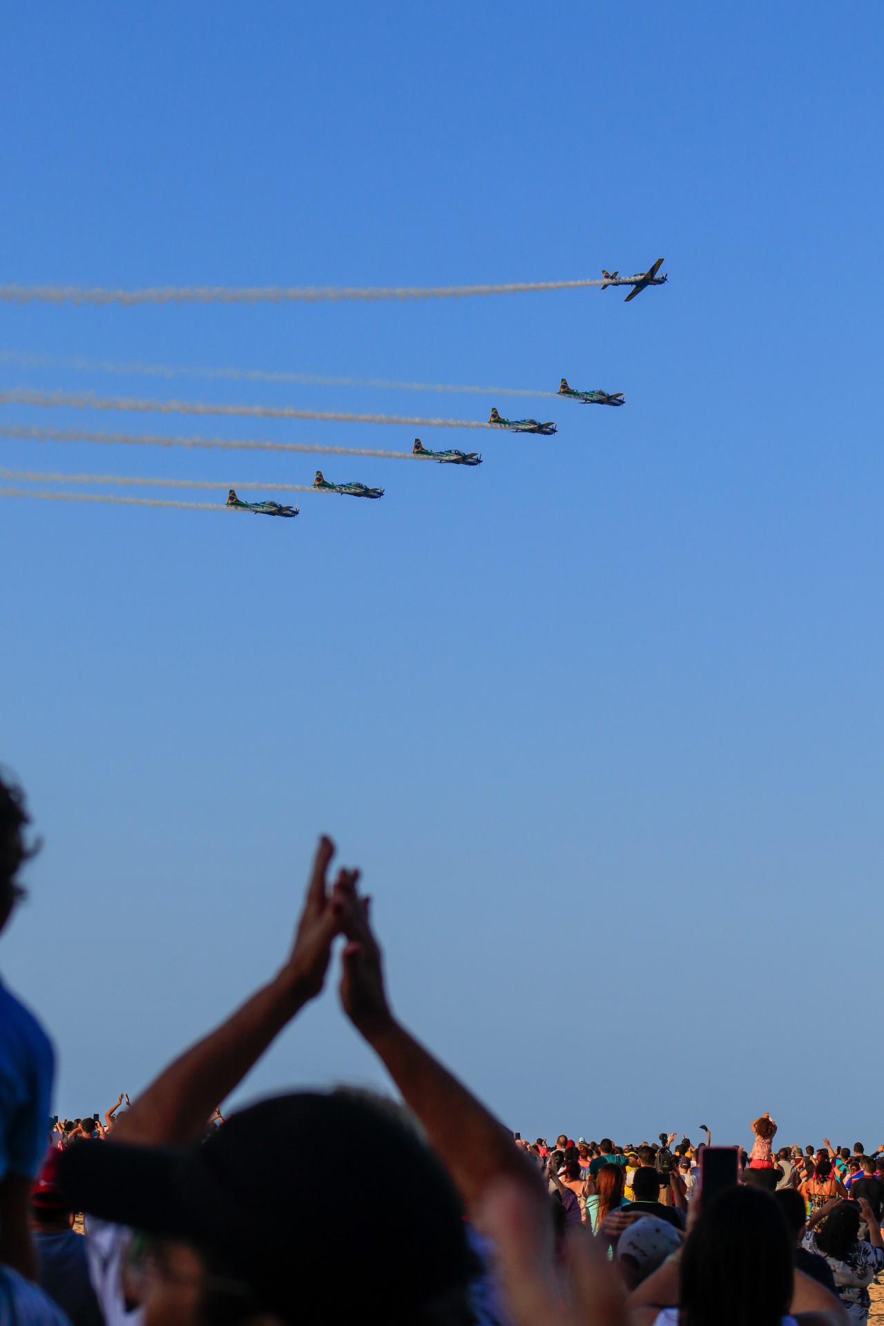 Um grande fluxo de veículos deixou o trânsito pesado nas ruas que davam acesso ao aterro, mas quem conseguiu chegar a tempo de pegar a apresentação desde o começo se empolgou com a primeira manobra, iniciada próximo ao porto do Mucuripe: os sete aviões modelo Super Tucano A-29 se posicionaram como se fossem apenas uma grande aeronave e fizeram um rasante no espigão da Rui Barbosa.