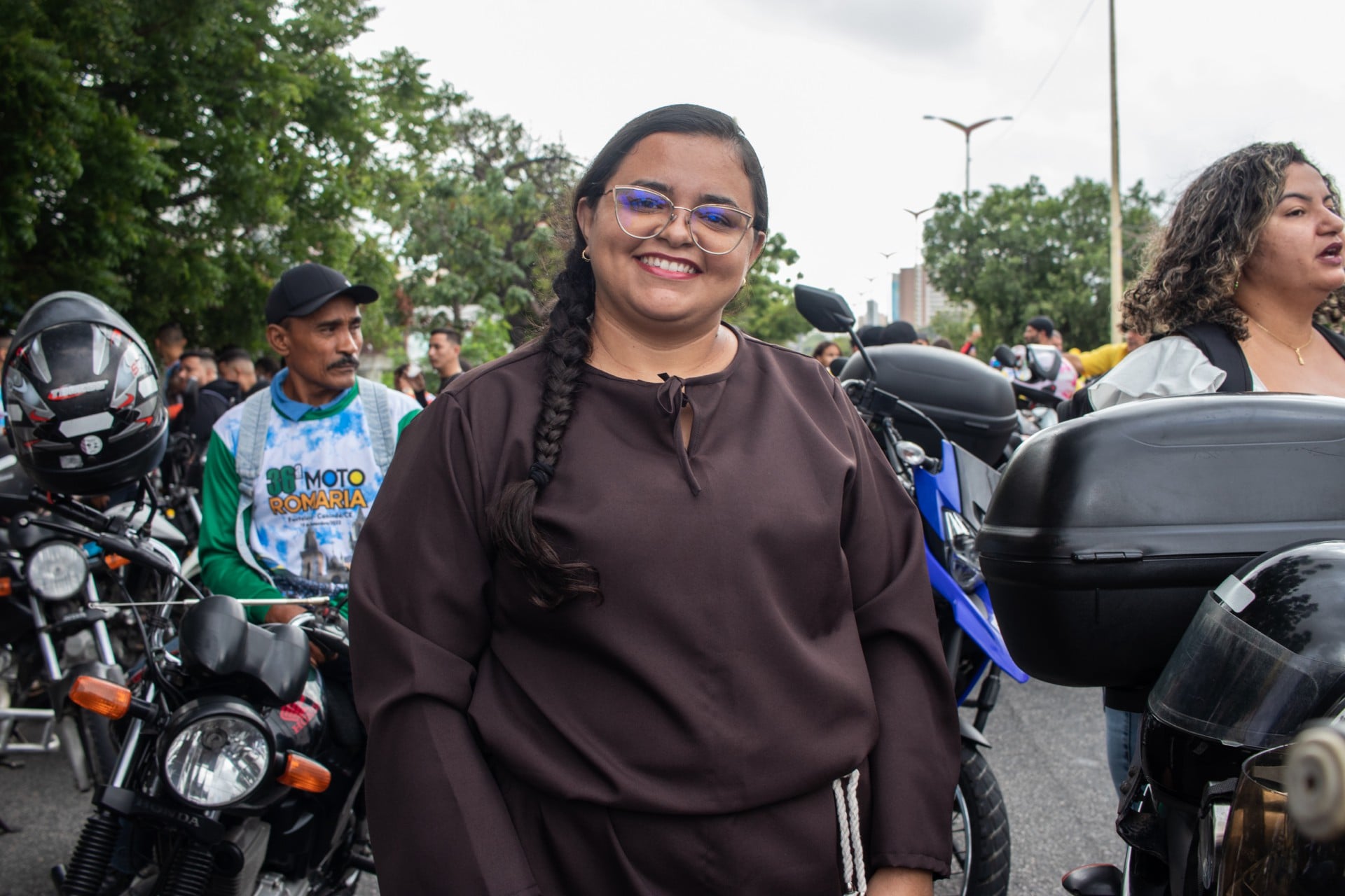 Maria Dalina, mais conhecida como “Morena”, tem 31 anos e trabalha com telemarketing. Calçando botas de bico fino, ela esbanjava estilo usando um capacete com tranças coloridas. "É a representação da minha felicidade. Sou motociclista e as pessoas me conhecem. Todos os anos eu e meu marido vamos de moto para Canindé nesta romaria, e como passamos dois anos sem poder ir, agora é motivo para celebrar ainda mais. Só peço a Deus para essa neblina passar e não chover mais”, disse.
