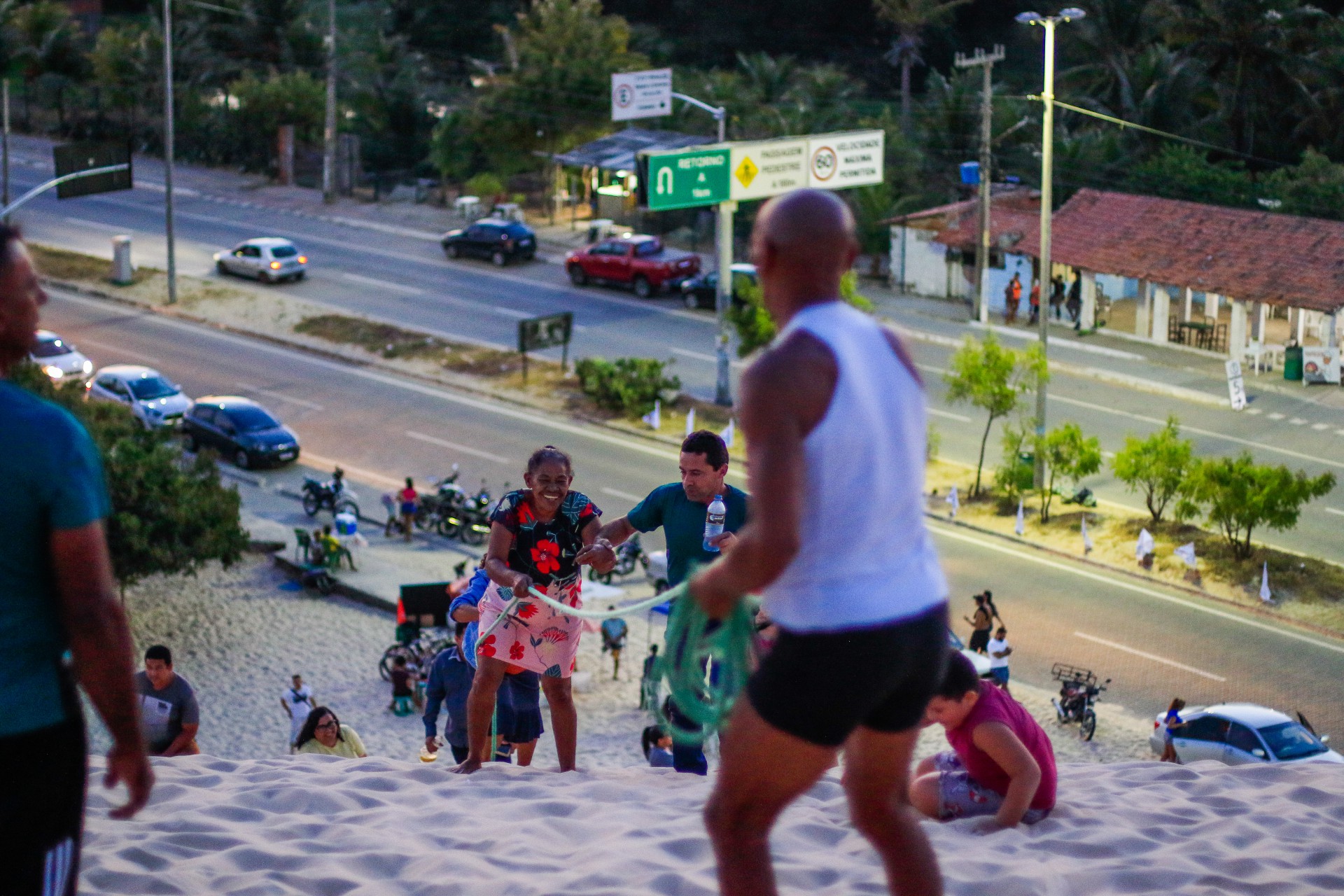 "Eu gosto daqui porque pra mim (subir) é um esporte, e através do esporte eu vendo. Eu dei essa ideia (da corda) pra ficar mais fácil o povo subir. Nem todo mundo tem condição de subir essa duna, ai nós trouxemos a corda, e graças a Deus muita gente tem subido", pontua o ambulante.