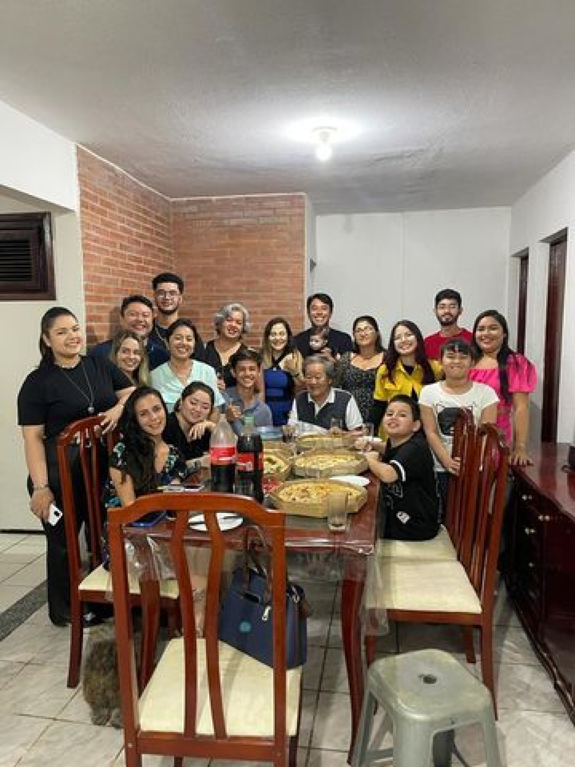 A filha explica que, no dia do aniversário do pai, a família, de descendência japonesa, reuniu-se para comemorar. A princípio, a ideia era ir a um rodízio de carnes, mas os planos mudaram devido a um mal estar do senhor, e eles decidiram celebrar com pizzas na casa dele.