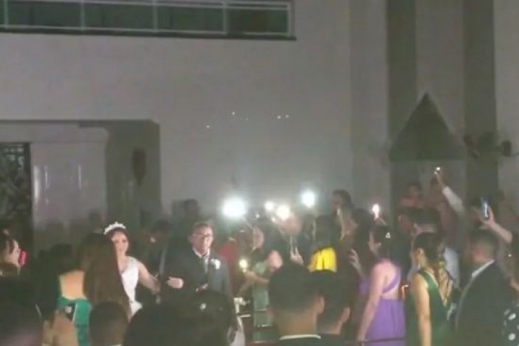 Em vídeos registrados no momento da cerimônia, é possível observar os convidados iluminando o corredor da igreja com os telefones para que fosse feito o cortejo dos padrinhos.