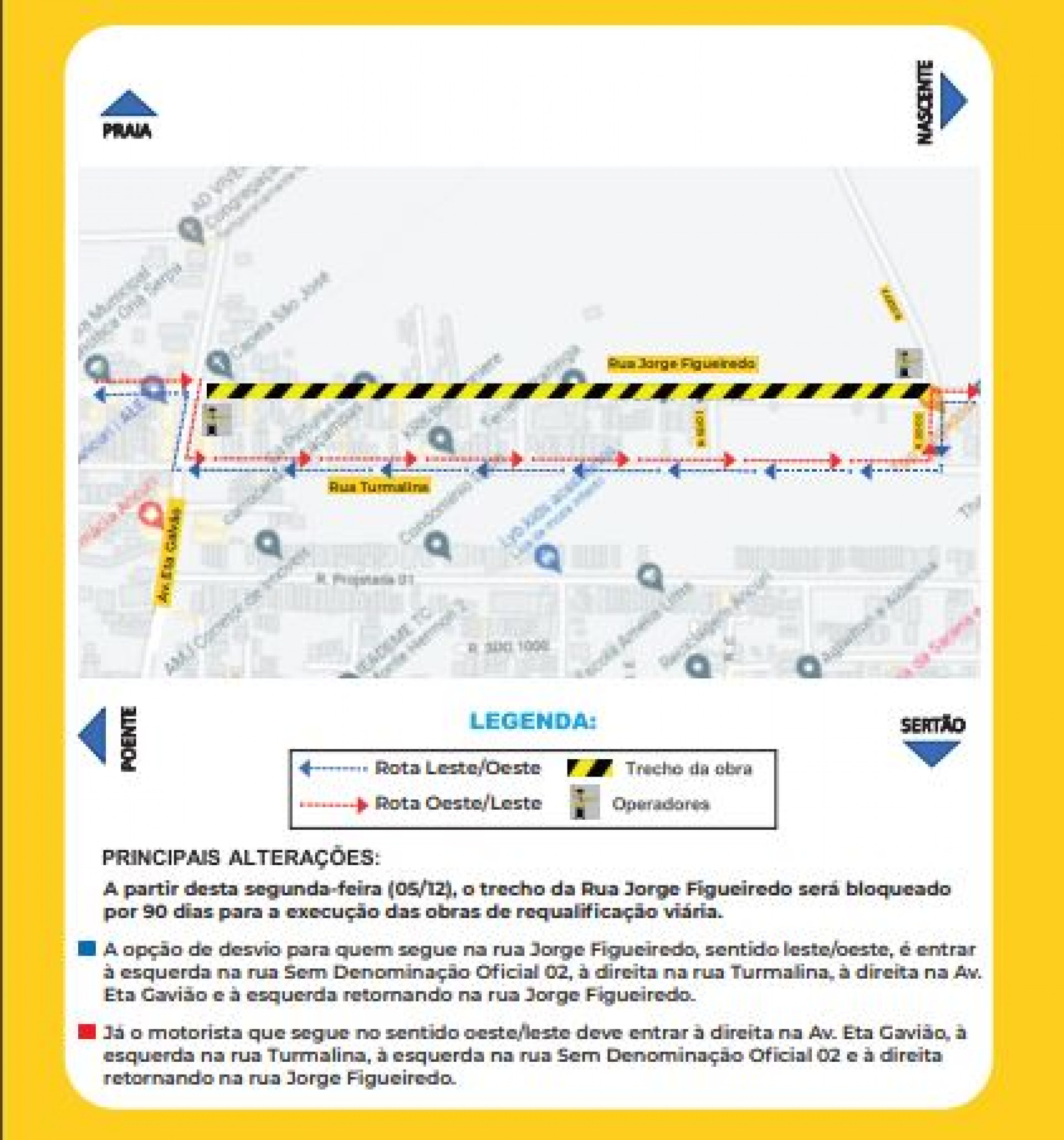 A partir desta segunda-feira, 5, o trecho da rua Jorge Figueiredo, localizado entre a avenida ETA Gavião e a rua Sem Denominação Oficial 2, será bloqueado por 90 dias para a execução das obras de requalificação viária.