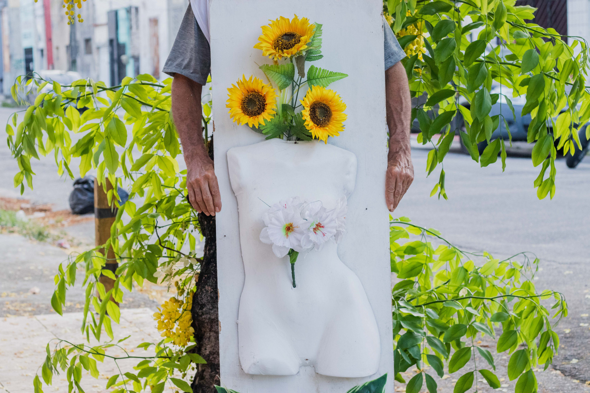 Amor e respeito ao meio ambiente é o que o artista plástico Carlos Careca, de 60 anos, busca retratar por meio de sua arte. Ao transformar peças de manequins, caixas de sapato e restos de madeira em uma exposição, o morador da Praia de Iracema, em Fortaleza, tem como objetivo representar a luta no combate à violência contra a mulher e outros tipos de preconceitos velados em sociedade, como lgbtfobia, xenofobia e racismo.
