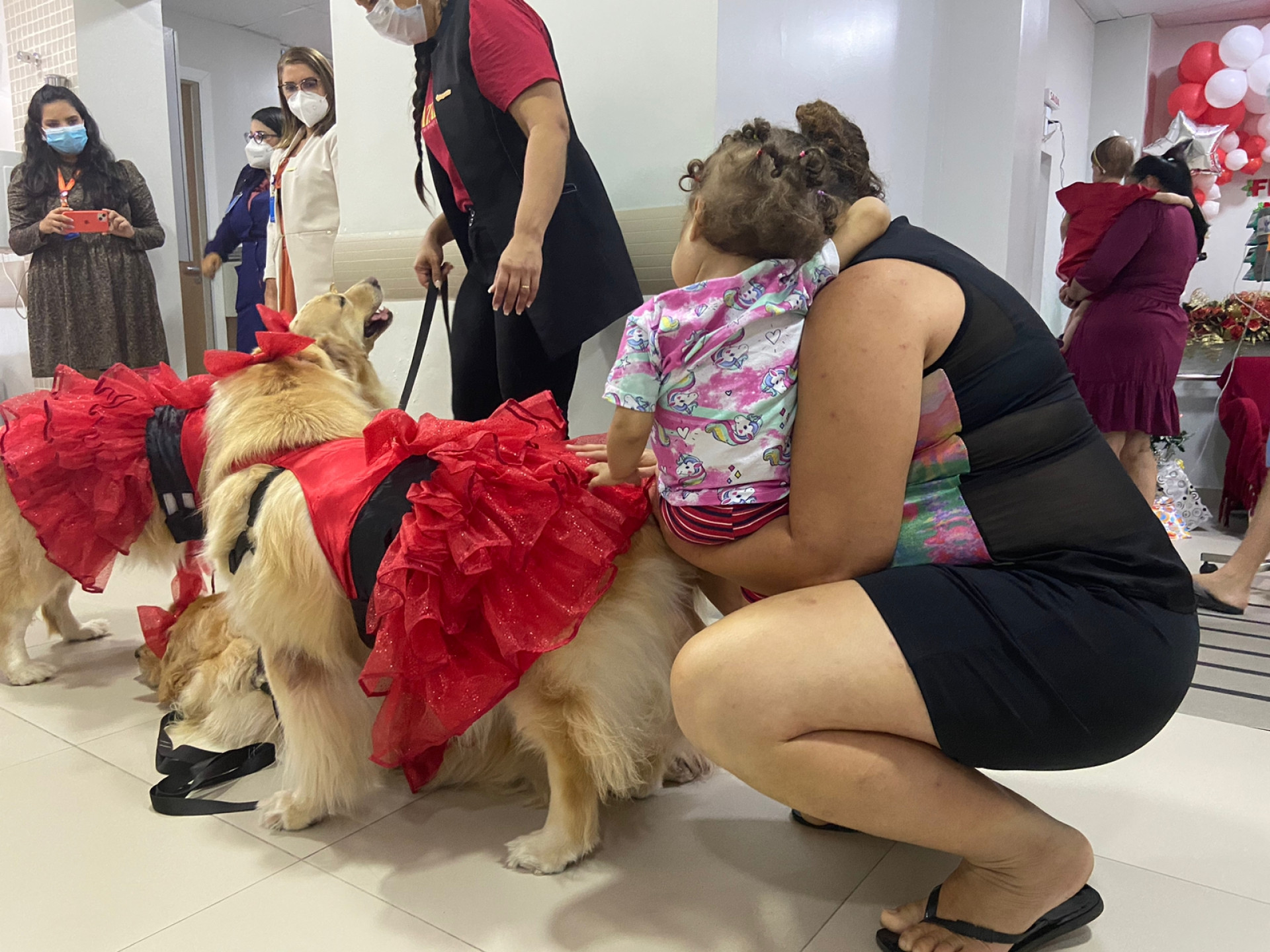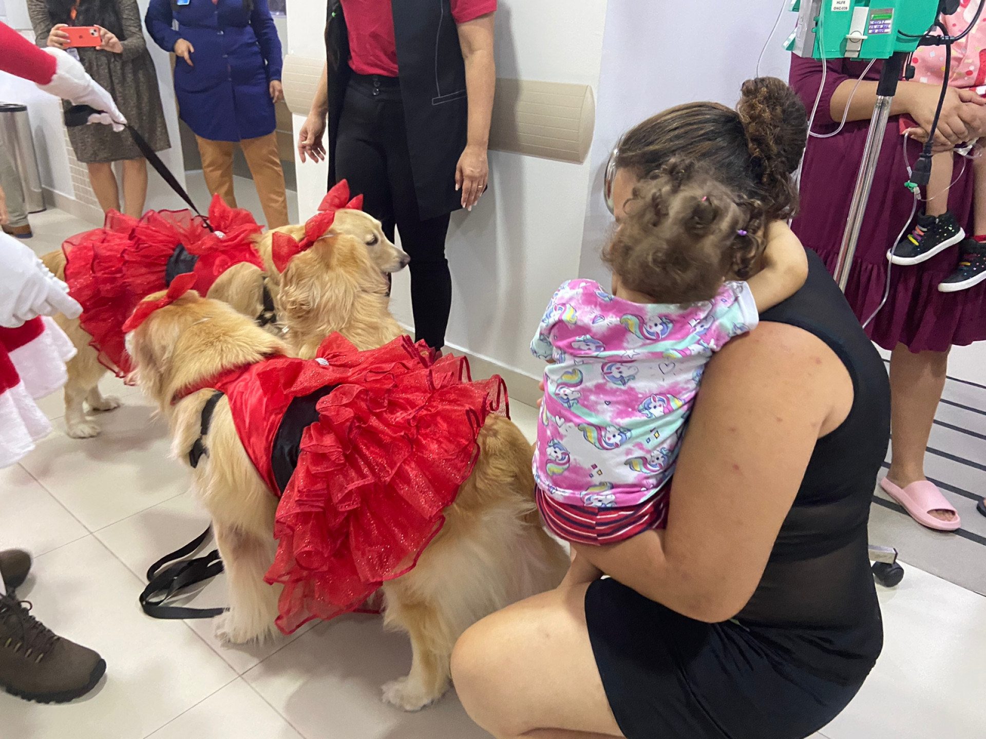 A magia e o divertimento tomaram conta da rotina de crianças internadas na ala oncológica do Hospital Infantil Luís França, no Centro de Fortaleza, na manhã desta terça-feira, 20. Entre troca de afetos e risadas, os pequenos partilharam um momento de lazer com uma equipe animada e canina: três cachorros da raça Golden retriever, Mamãe Noel, Papai Noel, profissionais de saúde e os pais.