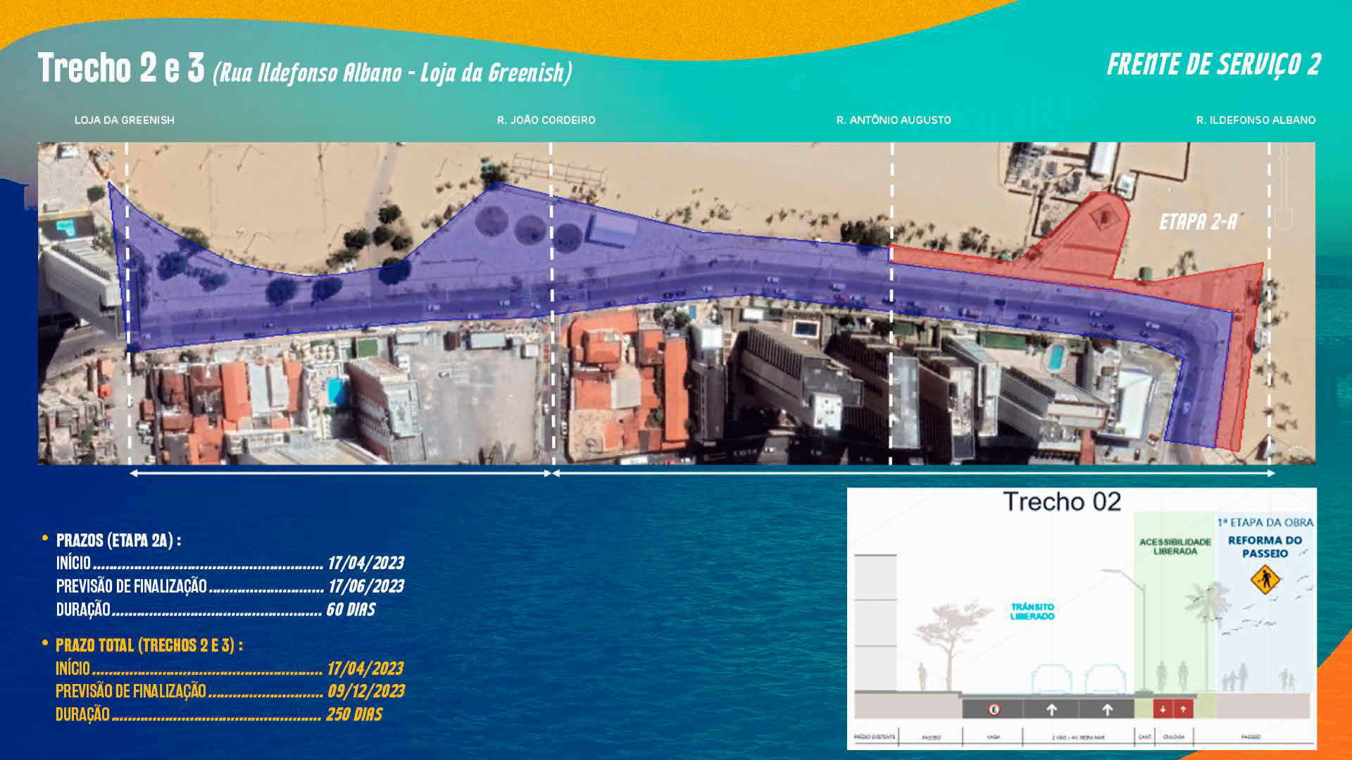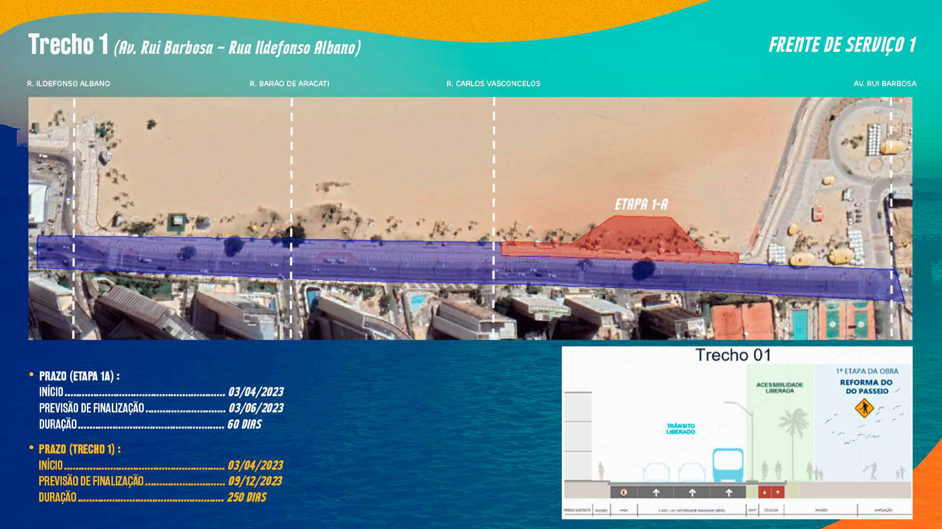 Entre as intervenções, está a criação de novos passeios no calçadão da praia, de mini praças, caramanchões, ciclovia, nova iluminação em LED e um novo projeto de paisagismo que, segundo a Prefeitura, tem o objetivo de tornar o clima mais ameno, proporcionando "mais sombras para a região".