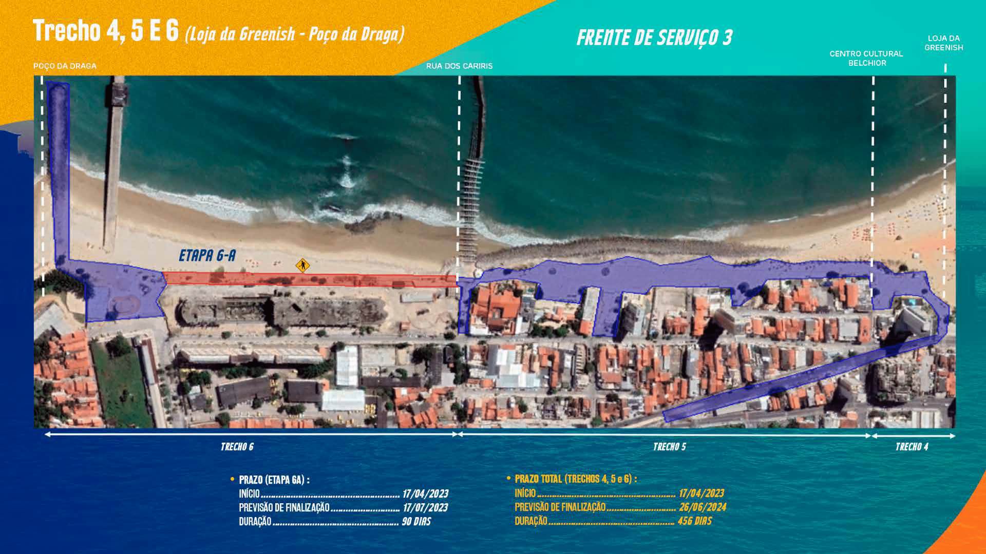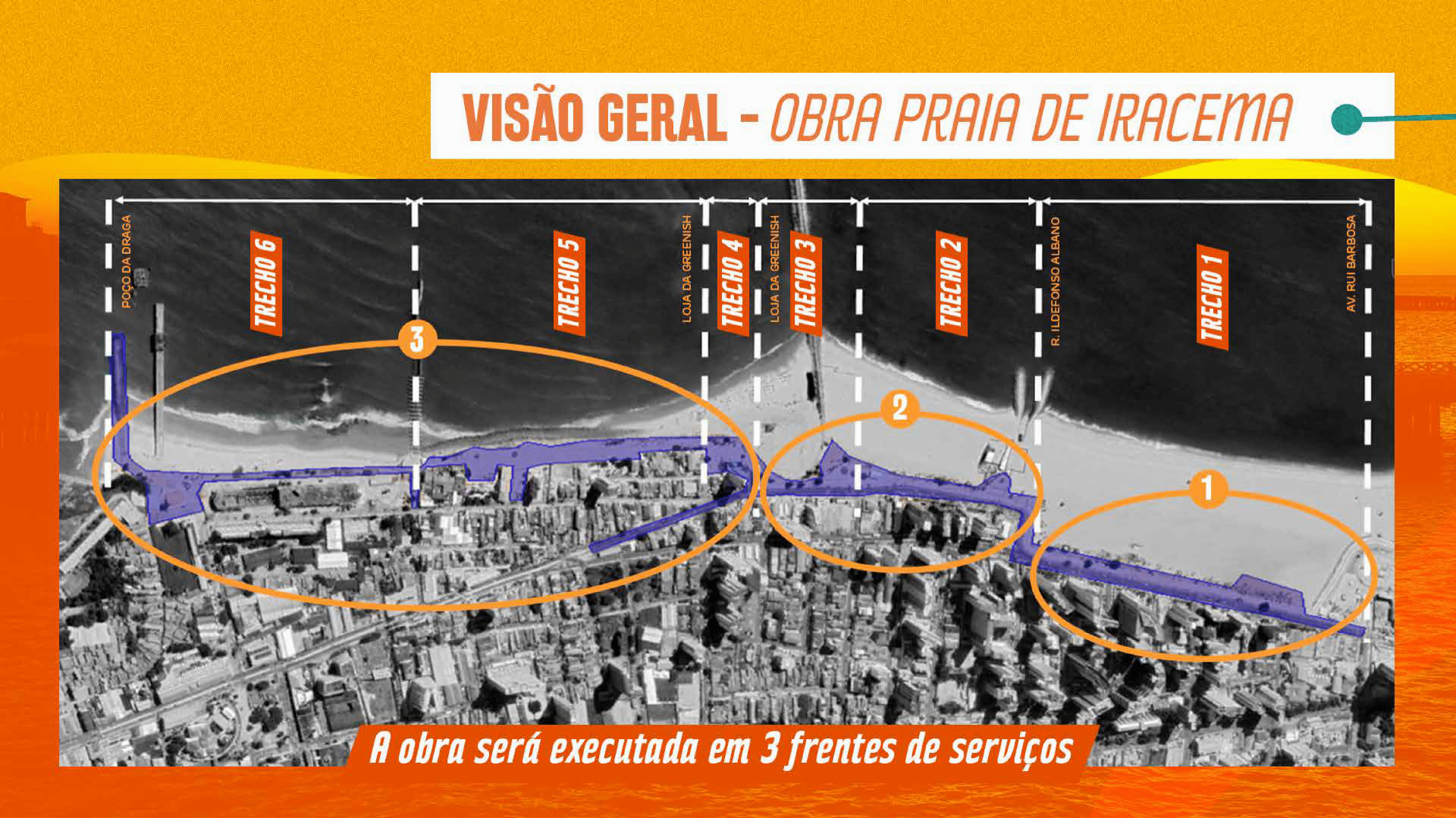 As obras da requalificação da Praia de Iracema começam na primeira segunda-feira de abril, dia 3, e são divididas em três frentes. O projeto conta com um investimento de R$ 26,1 milhões, e parte desse valor é oriundo do Banco de Desenvolvimento da América Latina (Caf).