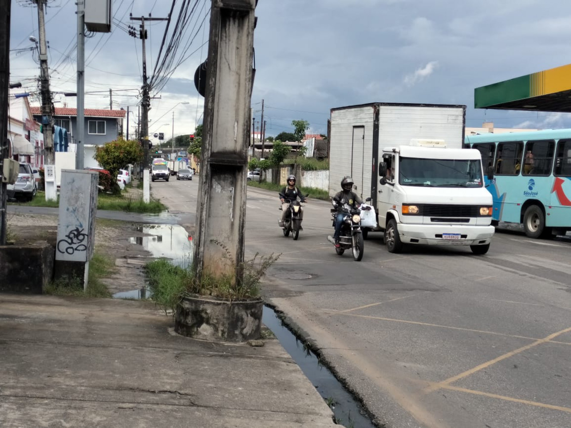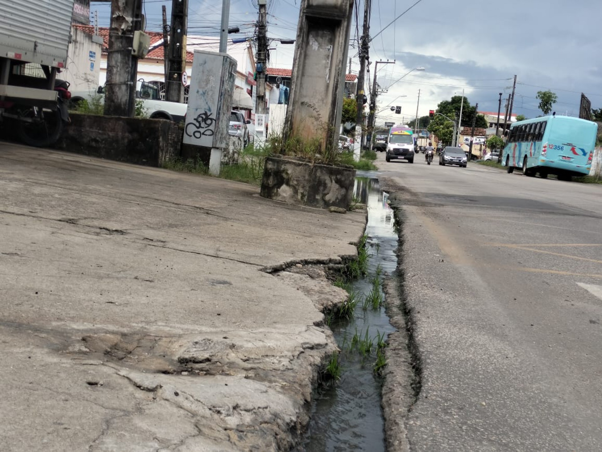 No cruzamento entre a avenida João Pessoa e a rua Ceará, no bairro Montese, em Fortaleza, dois bueiros foram danificados, um deles afetando diretamente a faixa de ônibus da avenida.