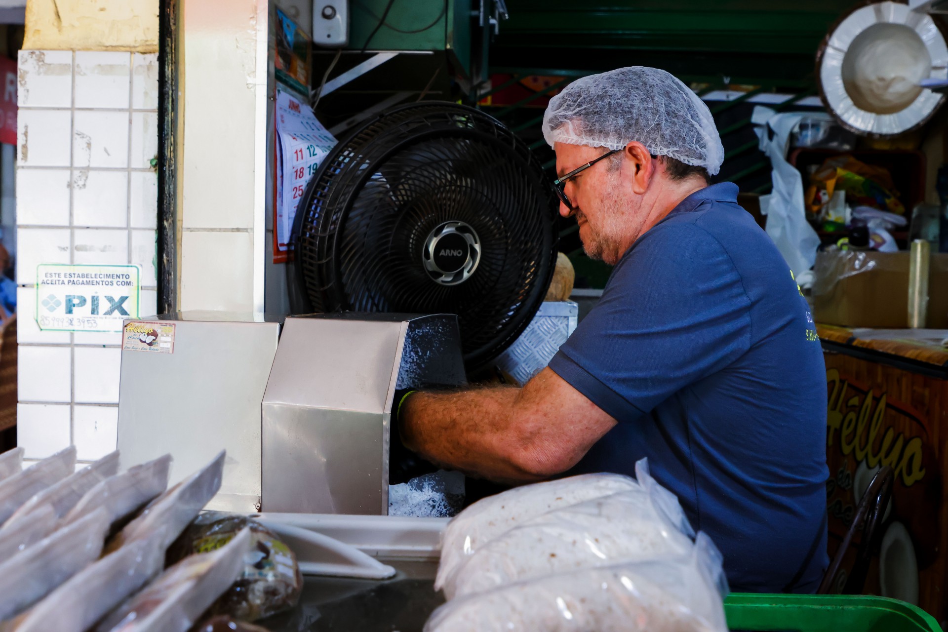 Helio Lima, conhecido como Hellyo do Coco no Mercado, diz que o movimento aumentou a partir do dia 1º de junho. Ele vende a R$ 19 o quilo do coco ralado. "Alguns compram mais, menos. A gente dá um jeito. O cliente que diz. A gente faz qualquer quantidade a partir de R$ 3", explica. O ingrediente é usado principalmente para o preparo de bolo e de cocada.