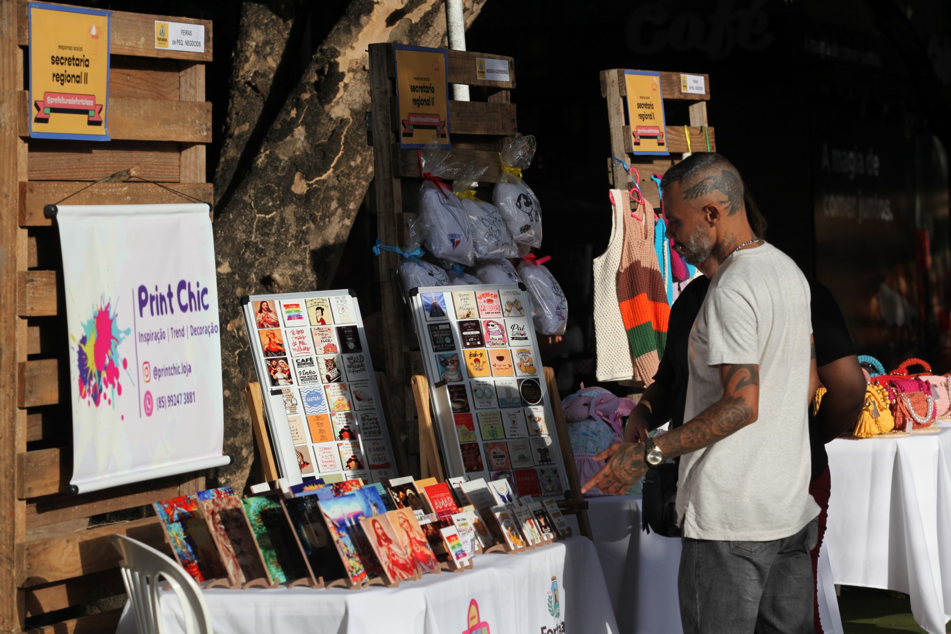 Quem passava pelo espaço se encantava com a diversidade de produtos e trabalhos feitos a mão. Foi o caso de Emerson Silva, de 23 anos, que fez questão de parar para olhar os stands e conversar com os empreendedores, se deixando encantar por cada material que via.