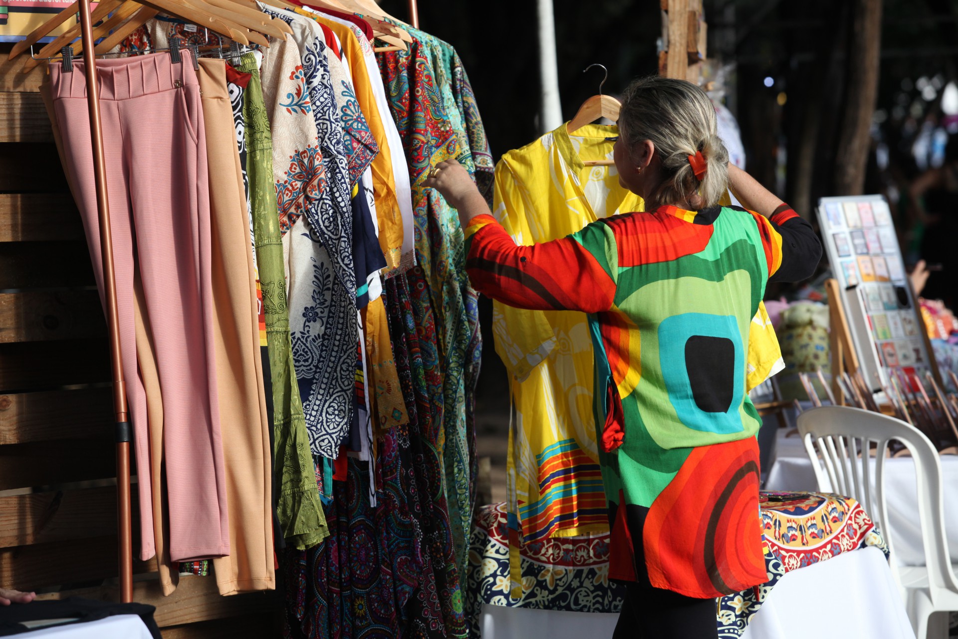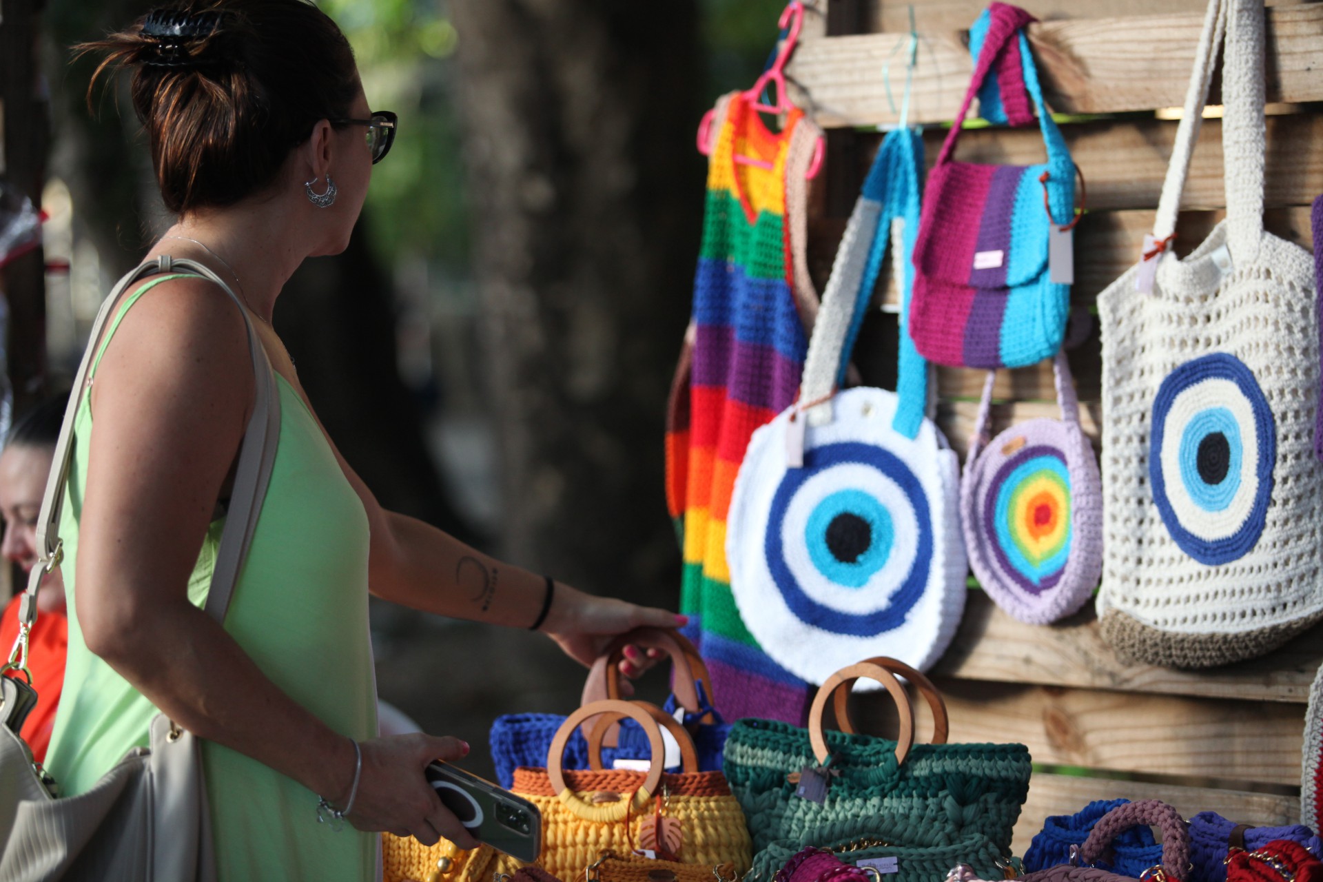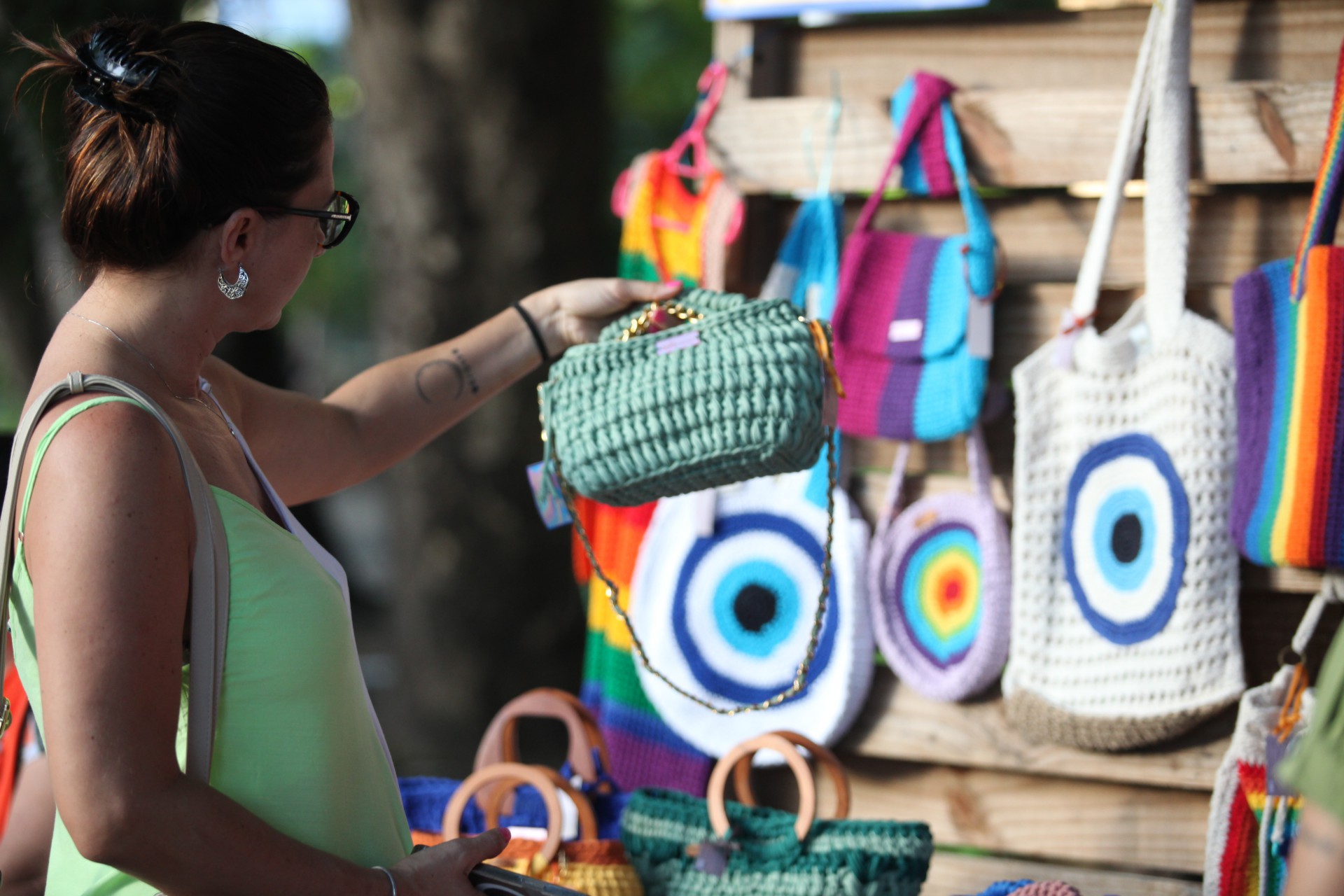 Irlete Freitas, de 58 anos, também passou pelos stands artesanais e se encantou pelo que viu. Ela gostou tanto que indicou o local para dois amigos estrangeiros conhecer. Enquanto esperava por eles, chegou a "namorar" com uma bolsa, mas devido a diversidade que encontrou, escolheu seguir olhando os produtos.