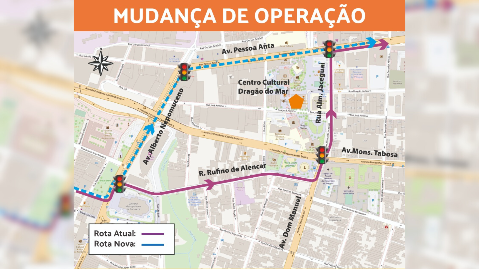 Até o momento, as linhas, que circulam pela rua Rufino de Alencar, entram à esquerda na av. Dom Manuel e seguem pela rua Almirante Jaceguai. A partir de sábado, os ônibus passam a trafegar pela rua Alberto Nepomuceno e a entrar à direita na av. Pessoa Anta.