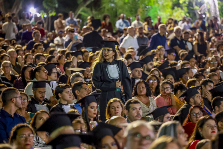 Depois de um hiato de mais de três anos, a Universidade Federal do Ceará (UFC) voltou a realizar colações de grau presencialmente. Primeira solenidade do porte ocorreu na noite desta quarta-feira, 4, na Concha Acústica da Reitoria, e contou com a participação de 1193 pessoas. Dentre elas, concludentes e egressos que já concluíram o curso e não haviam participado de forma presencial da tradicional cerimônia.