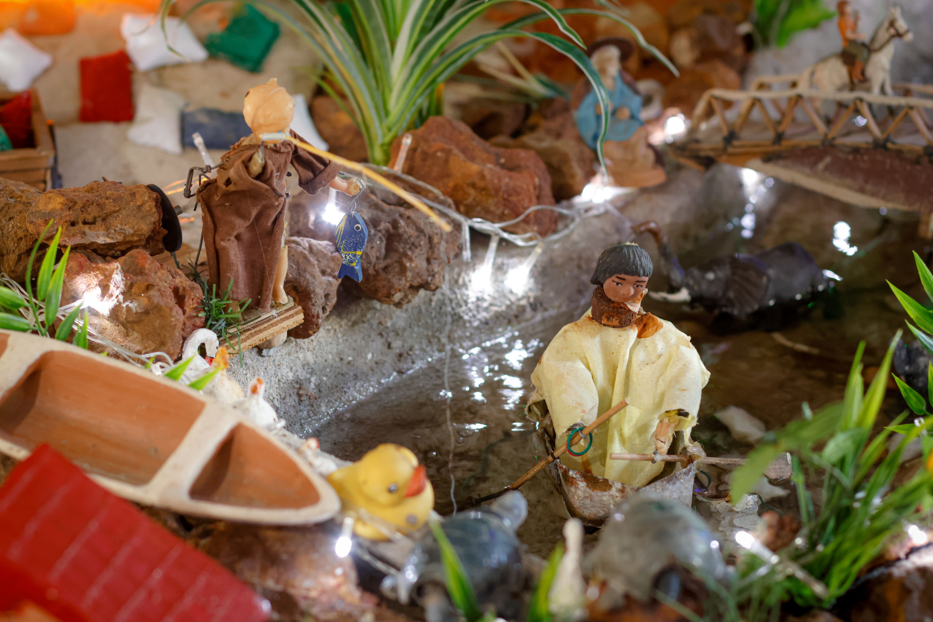 Três peixes-beta que moram no lago da lapinha para se alimentar de possíveis larvas de mosquitos também precisam de cuidados. Os bonecos, alguns com quase 100 anos, necessitam de manutenção constante. Se alguma peça sai do lugar, é preciso saber como colocá-la de volta no complexo arranjo de miniaturas.
