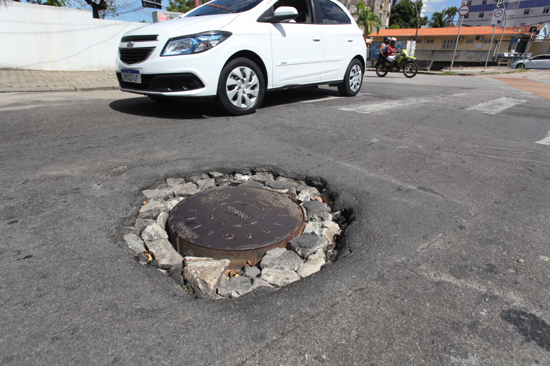 Situação pode causar acidentes e gerar prejuízos nos veículos, conforme motoristas. Reparo dos bueiros pode ser de responsabilidade da Prefeitura ou da Companhia de Água e Esgoto do Ceará (Cagece)