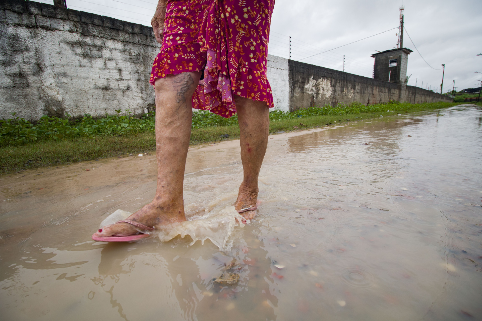 Dona Maria relata que alagamentos são constantes na região, não sendo incomum a água adentrar a casa dos moradores. A idosa ainda relata que contraiu frieiras na pele dos pés por ter que passar pelas poças de água suja. “Aqui não está feio. Está horrível”, conclui.