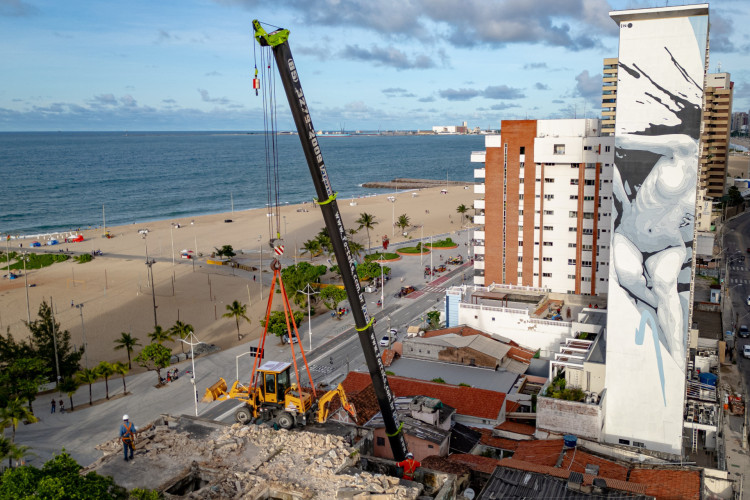 Os trabalhos de demolição do Edifício São Pedro, na Praia de Iracema, avançam e a cobertura já está parcialmente demolida 17 dias após início do serviço. Nesta sexta-feira, 22, a Secretaria Municipal da Infraestrutura (Seinf) divulgou imagens dos trabalhos.