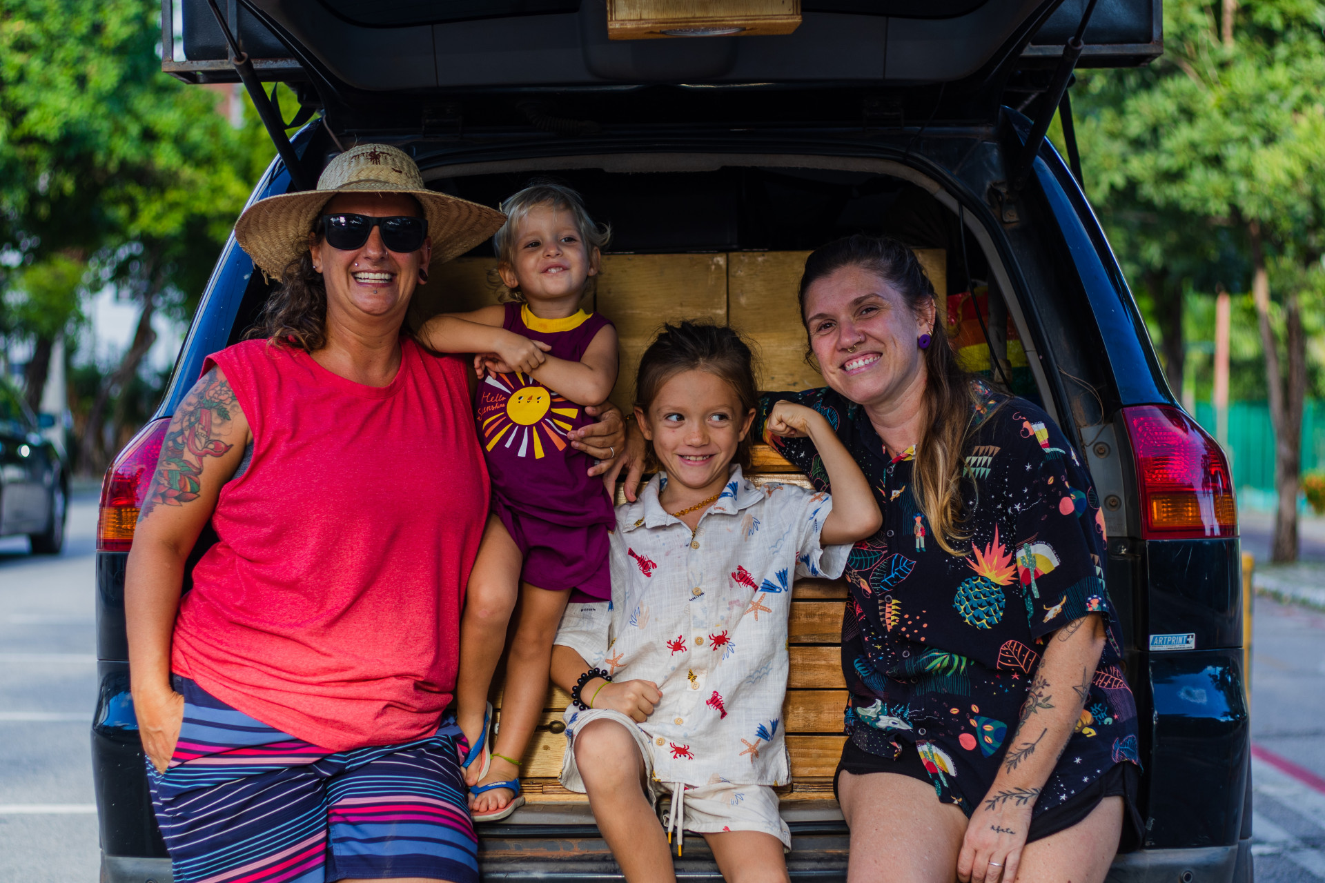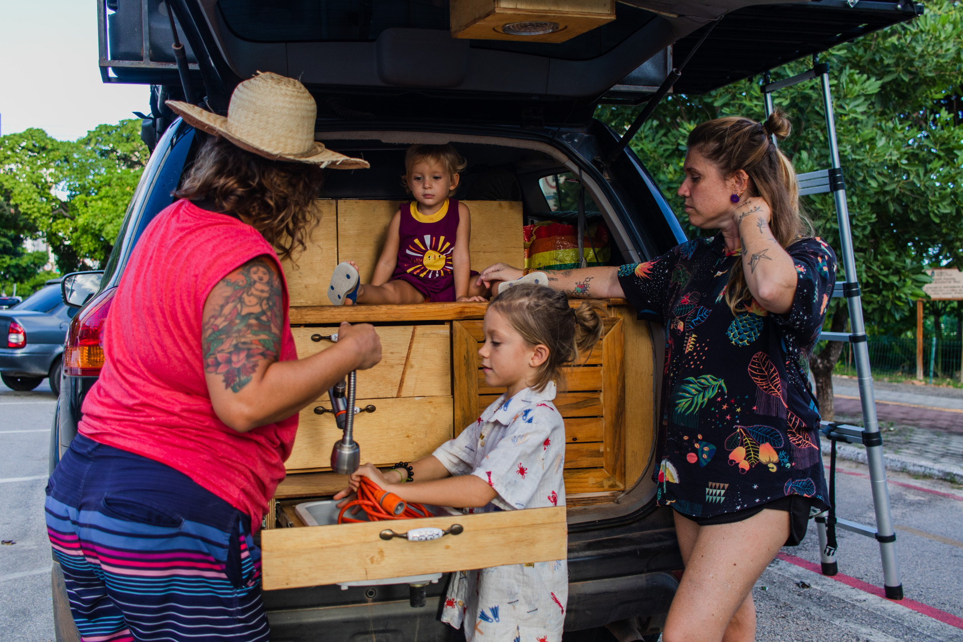 Benê tem uma grande missão. Ela é a responsável por levar a Mariana, 42, a Lizandra, 43, o Maitri, 7, e a Moana, 2, Brasil afora. Também serve como morada. Tem cama, geladeira, chuveiro, fogão, mesa. Benê tem mais de 230 mil quilômetros rodados, 15 mil só no último ano, já passou por 70 cidades e dez estados brasileiros. Há um ano, Benê é carro, casa e ninho de uma família nômade. Eles fazem parada em Fortaleza há quase um mês.