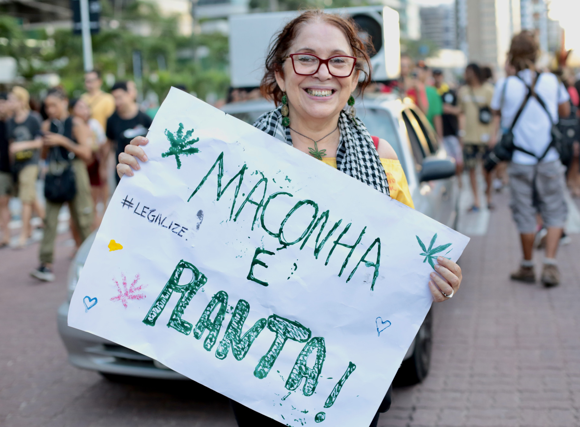 “Só agradeço à maconha”, diz a arquiteta e urbanista Sônia Bayma, que mora em um dos edifícios da avenida Beira-Mar e desceu para se juntar à manifestação. Desde a pandemia de Covid-19 ela faz uso do óleo de canabidiol, também conhecido como óleo de CBD, que ajudou a aliviar sintomas de ansiedade e insônia desenvolvidos durante o contexto pandêmico.