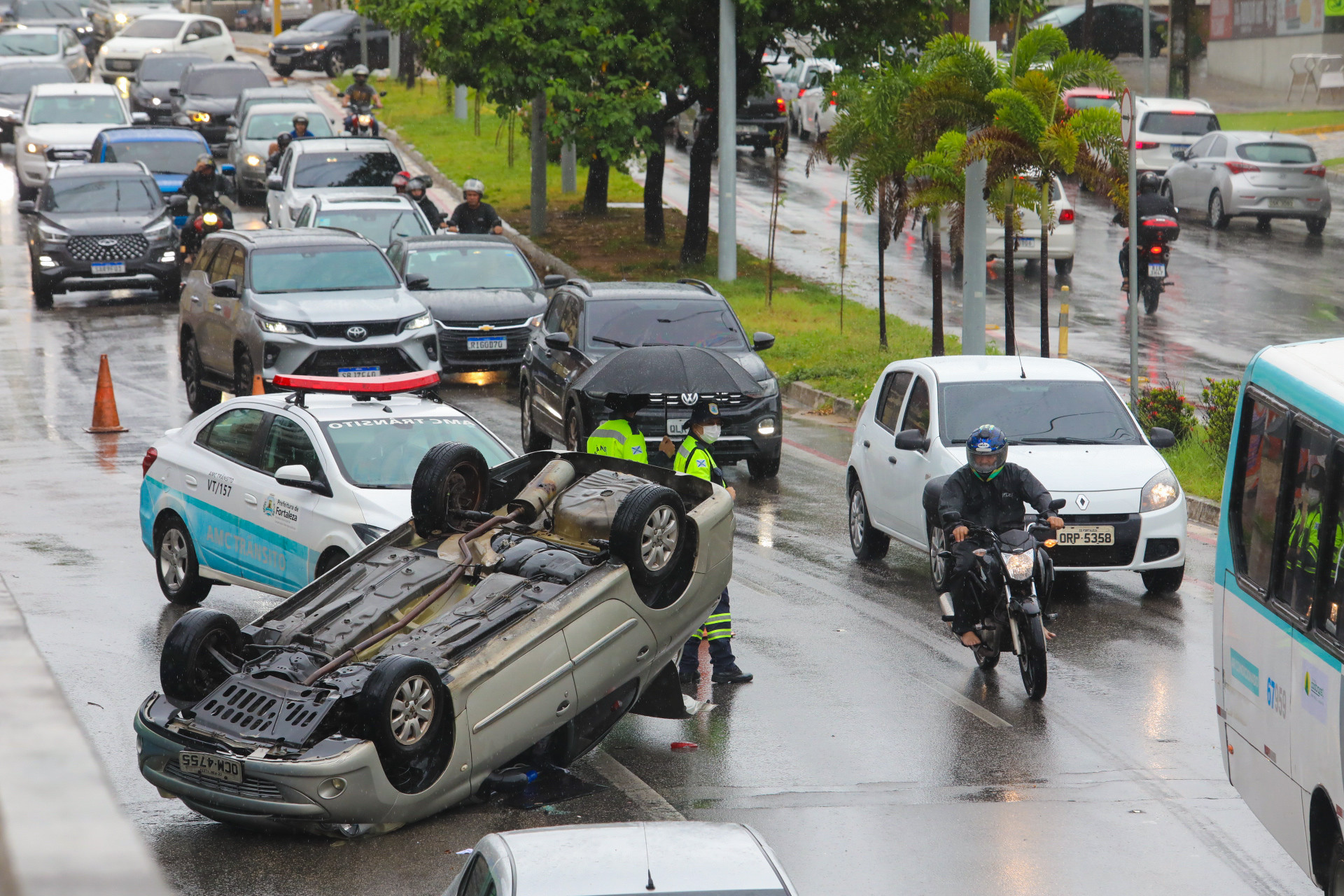 Um veículo capotou na avenida Engenheiro Santana Júnior, próximo ao túnel da avenida Padre Antônio Tomás. Segundo agentes da Autarquia Municipal de Trânsito e Cidadania (AMC) que controlaram o tráfego no local, apenas uma mulher estava no carro e ela não teve ferimentos ou lesões graves.