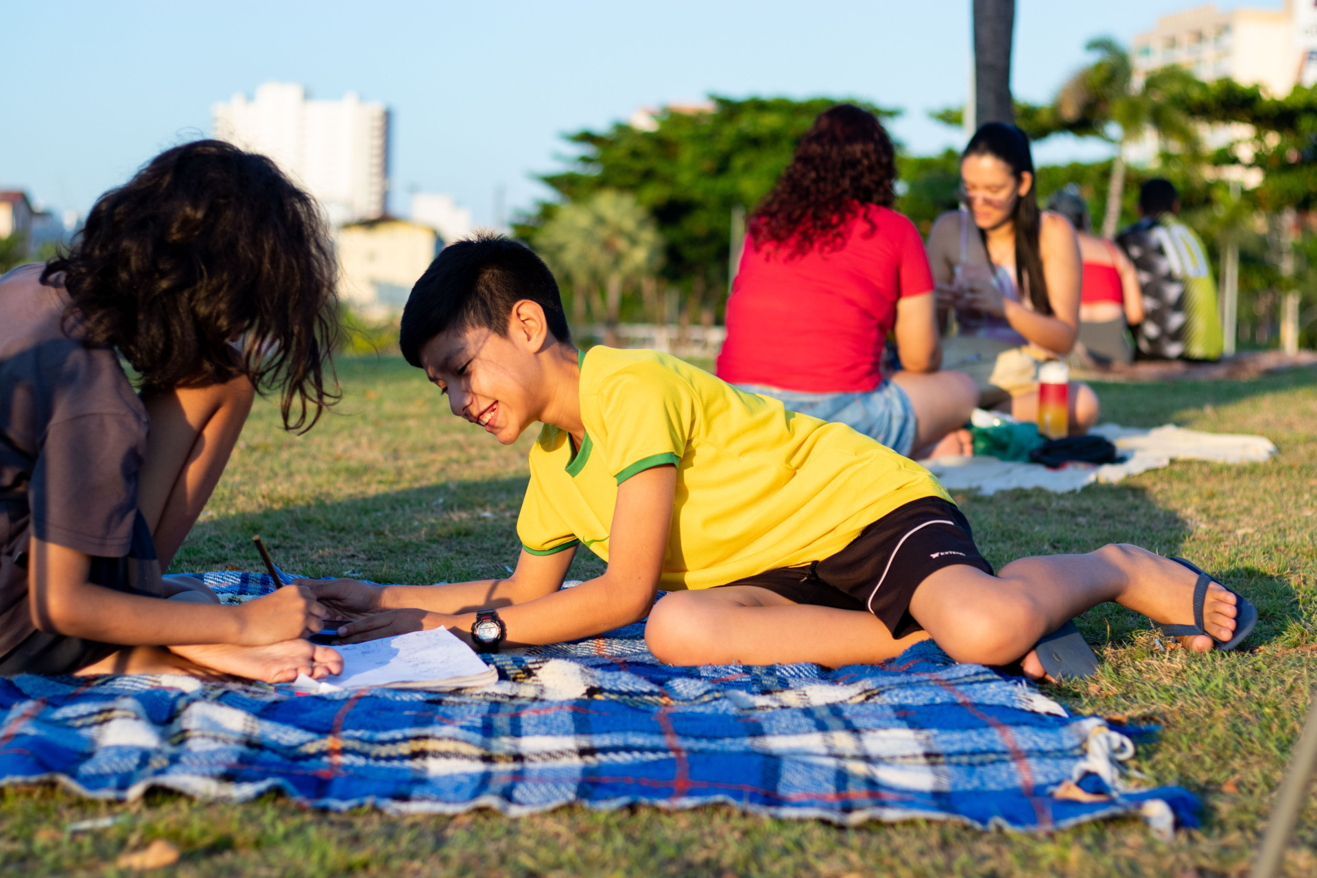 “Eles foram lá para casa e, sempre que vão, ficam muito na televisão e no computador. A gente vem para sair um pouco das telas. Nas férias, precisa ter esse espaço para eles, porque em casa é só isso mesmo que a criança tem, é tela”, comenta Mariana. "Hoje aqui a gente resolveu fazer pintura, só papéis e os lápis mesmo. Não nos organizamos muito; mas quando a gente organiza mesmo, traz jogos, bola e mini-golfe."