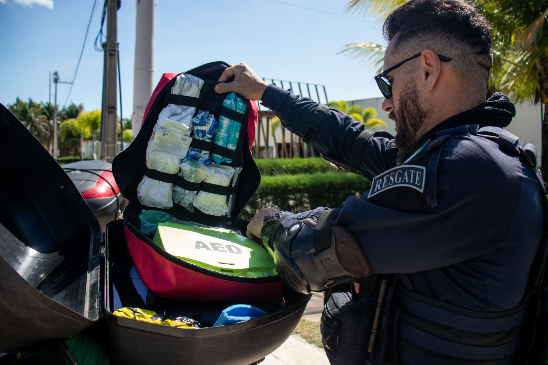 “Temos material de imobilização, itens para controle de hemorragias, como gazes, ataduras e soro fisiológico. Também carregamos um suporte de oxigênio e o desfibrilador externo automático (DEA), para casos de parada cardiorrespiratória”, esclarece o socorrista.