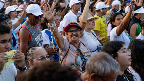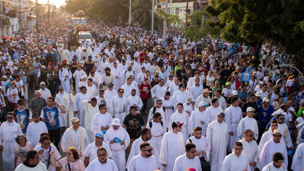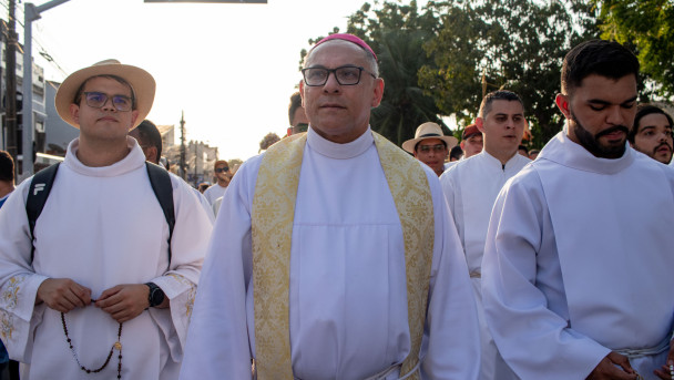 “Que esta caminhada seja uma manifestação da fé que trazemos no coração. Meus irmãos e minhas irmãs, saiamos aqui com coração contrito e humilde. Que nossa procissão, nossa caminhada seja manifestação da fé que trazemos no coração. Vamos em paz, com a Virgem Maria, e que o Senhor nos acompanhe”, declarou ele, após rezar o Pai-Nosso na abertura e antes de fazer o percurso andando na rua junto aos fiéis.
