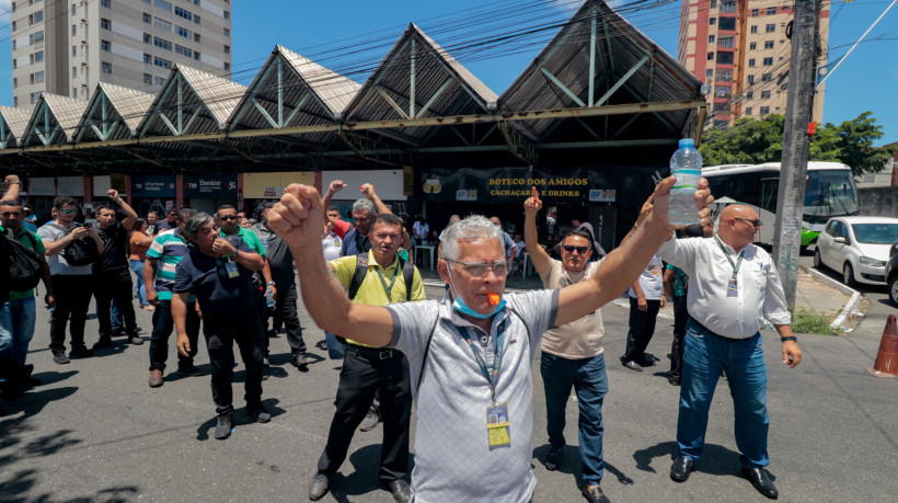 Os trabalhadores da empresa São Benedito protestaram, na manhã desta sexta-feira, 1º, contra a nova empresa que fará operações das linhas do Litoral Leste