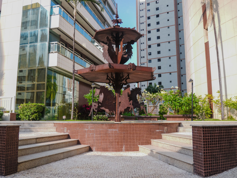 Quem atravessa o hall do condomínio Paço do Bem em direção aos apartamentos erguidos na extensão se depara com uma fonte de água no centro do jardim. A escultura do edifício, localizado no Meireles, foi instalada no terreno em 2010, ano em que a construção do residencial foi finalizada.
