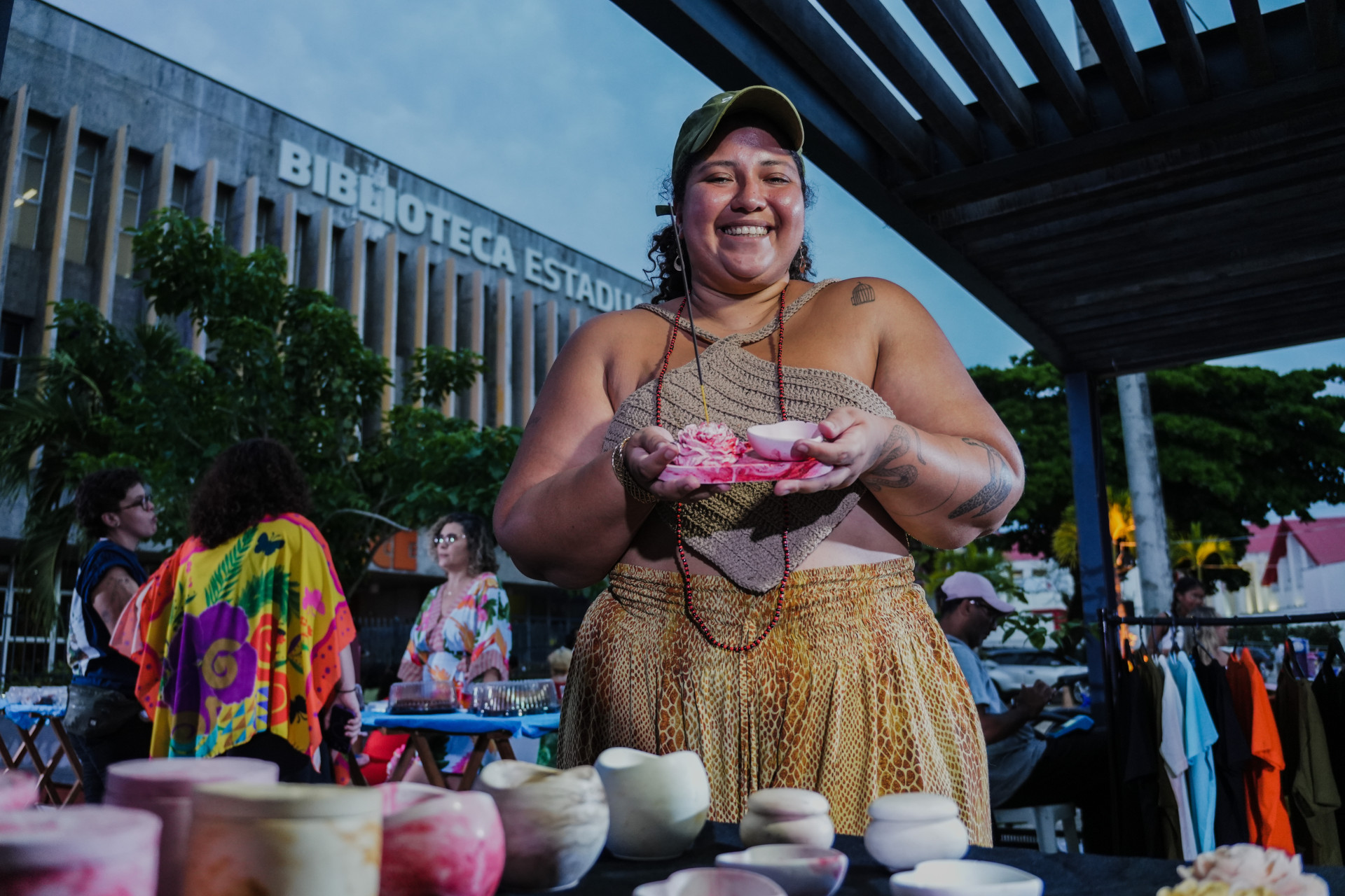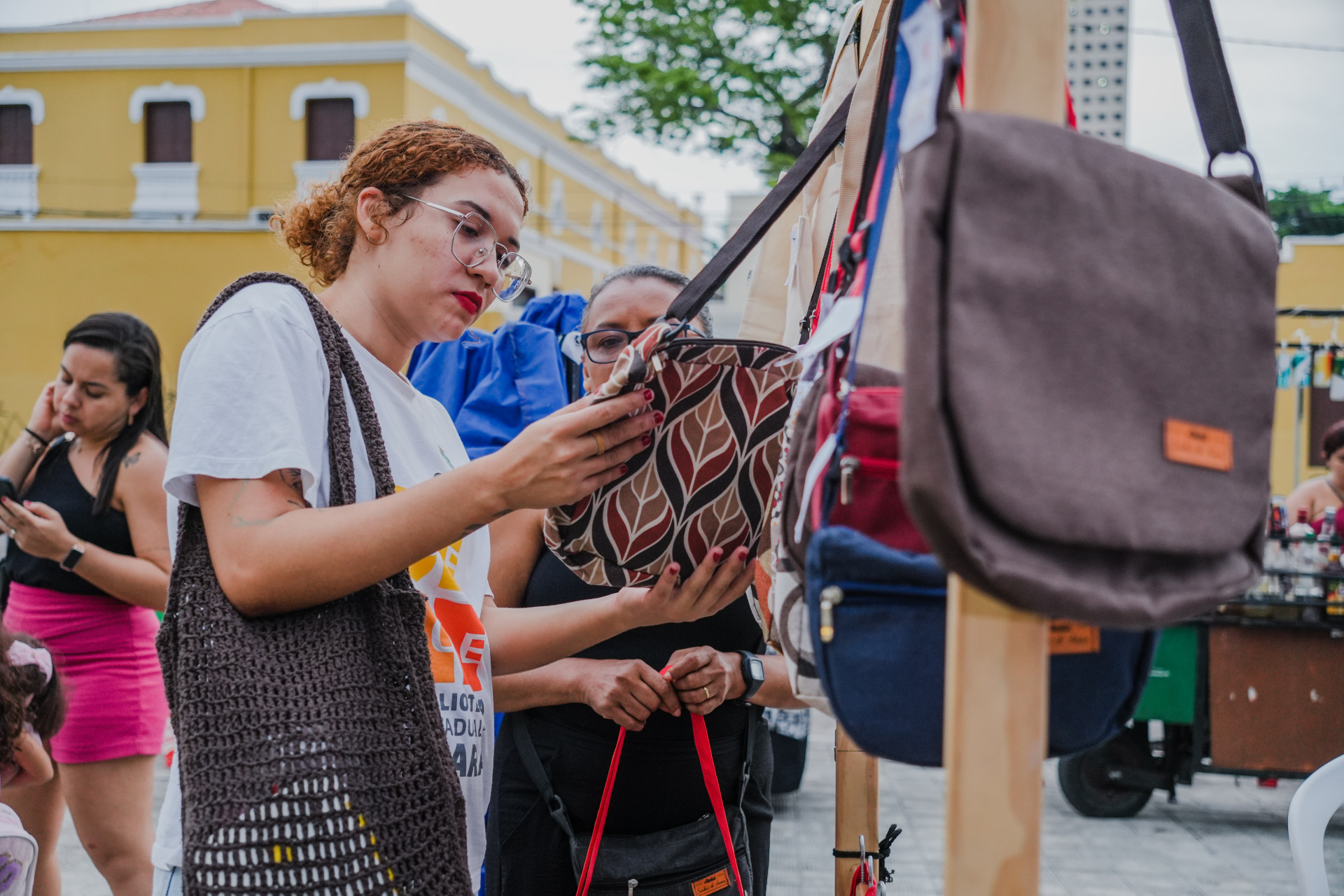 Expositora da Feira Negra, Ana Cristina dos Santos, 54, conta que mora no Grande Bom Jardim e veio para expor suas bolsas de costura pela primeira vez no evento. “Tive muita dificuldade para voltar pro mercado [de trabalho] por conta da idade. E aí eu peguei minha rescisão e investi, e tá dando certo”.
