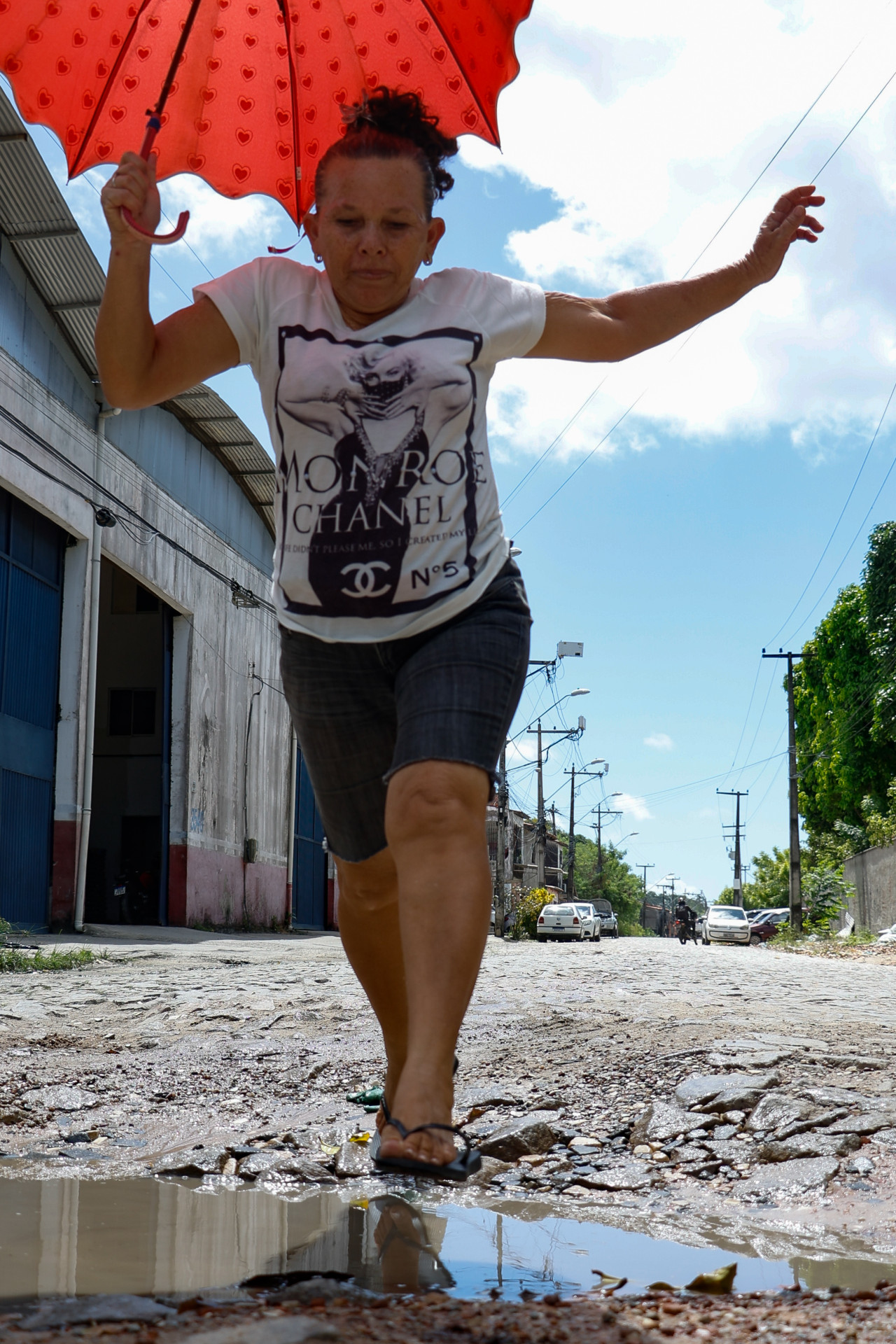 A moradora Vera Lúcia, que vive há 30 anos no bairro, conta que os riscos vão além dos danos materiais. “Quando chove ninguém passa, não. Fica escorregando, é muito perigoso. Outro dia um cadeirante caiu ali. A gente teve que parar um carro que estava passando pra ajudar a levantar ele”, conta.