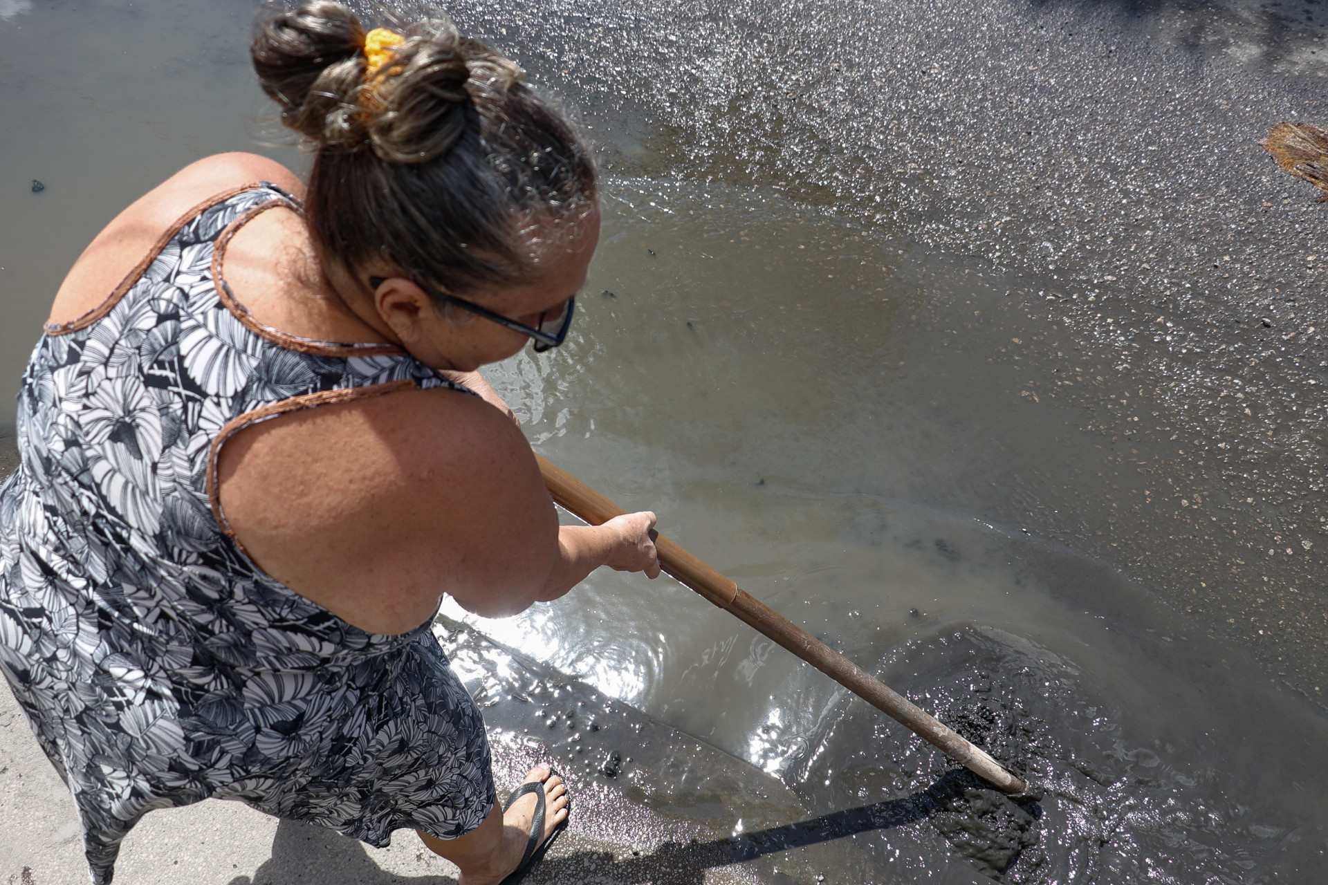 A comerciante Edileuda de França Oliveira, 70, conhecida como Leuda, é dona de um pequeno mercantil na Silas Munguba. Ela conta que, após a obra, a água agora se acumula em frente ao seu comércio, misturando lama, lixo e o próprio asfalto, que começou a se desfazer.