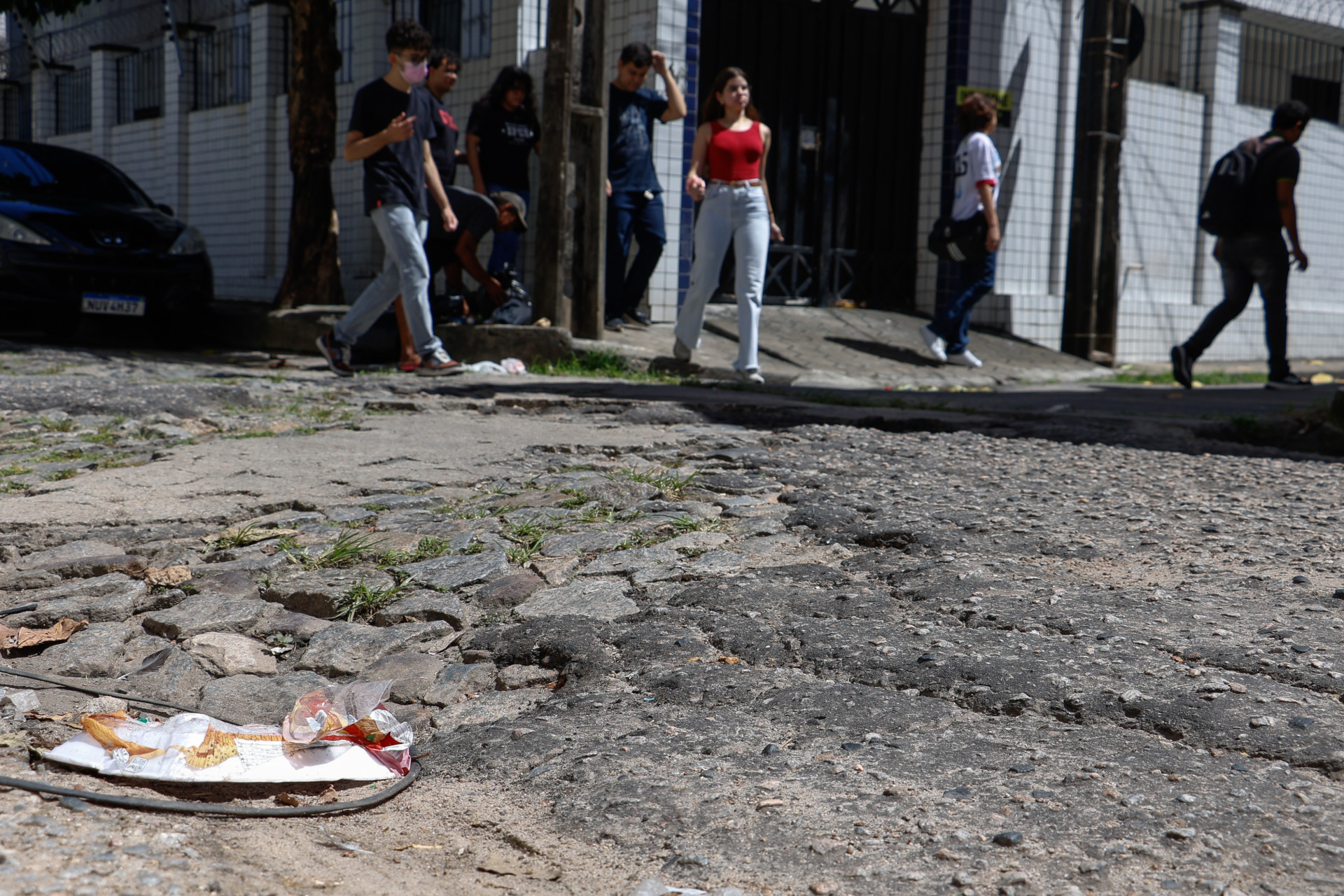 Problemas com buracos também se repetem em regiões mais centrais da Capital. No bairro Benfica, diversas ruas se enquadram na situação. Um exemplo é a rua Leandro Monteiro, onde o calçamento se desfez com a força da correnteza durante as chuvas, expondo as pedras do antigo calçamento sob a malha asfáltica.