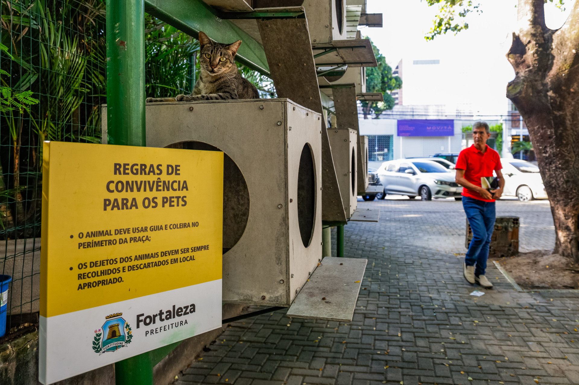 A frase, estampada em uma placa discreta na Praça das Flores, em Fortaleza, vai além das palavras. Entre as flores, bancos e caminhos de pedra, vivem hoje mais de 30 gatos, cuidados por uma rede silenciosa e dedicada de protetores que, mesmo sem vínculo institucional, garantem alimento, abrigo e, acima de tudo, respeito a esses animais abandonados.