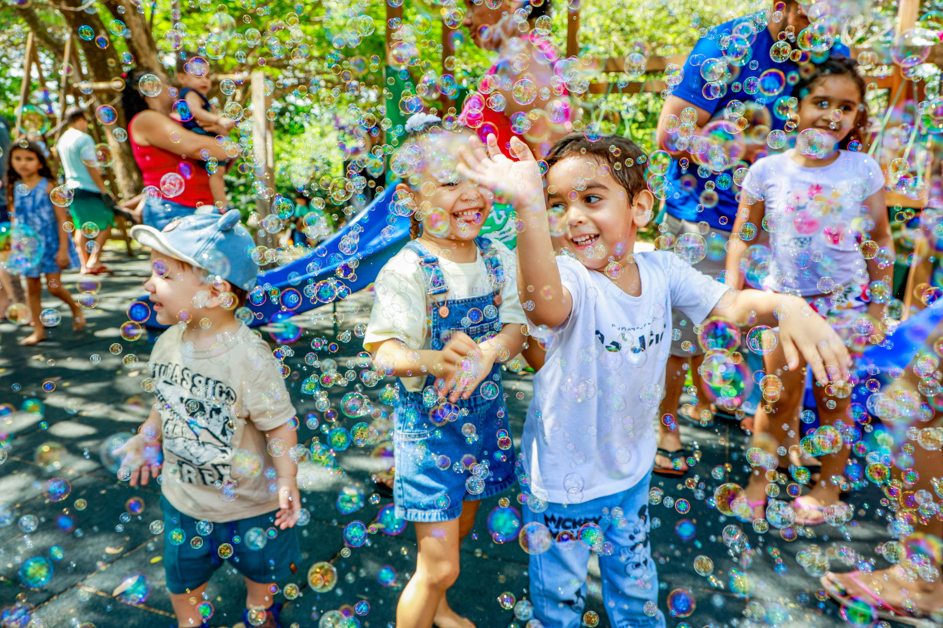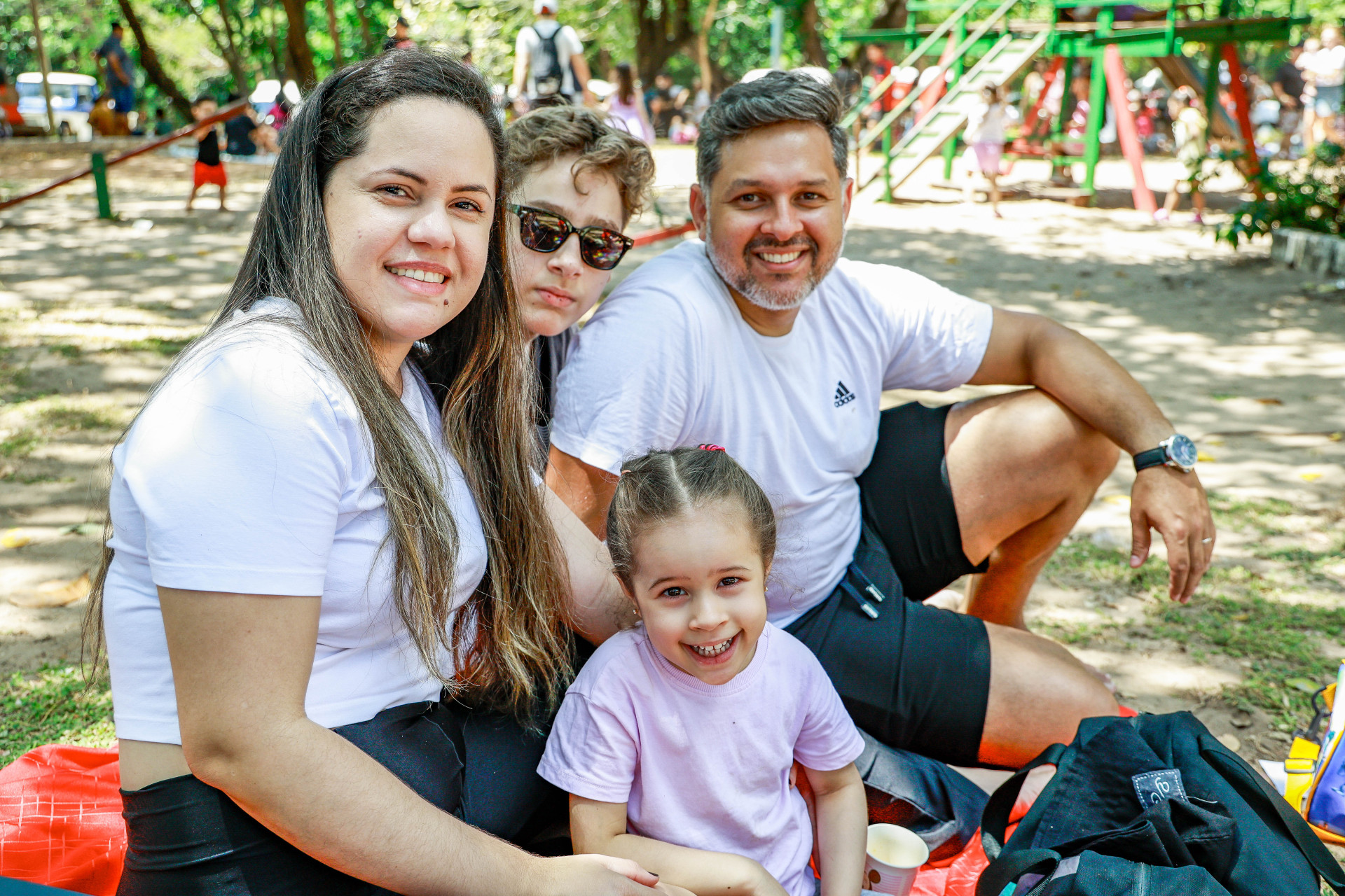 “É muito bom ter esse momento para aproveitar o ambiente da nossa cidade, onde tem árvores e ar puro. Decidimos fazer esse piquenique, criar esse vínculo porque queríamos evitar o shopping ou ambientes mais lotados”, afirma Denise, interrompida por Maria Alice, filha de 4 anos de Carine: “Gosto de brincar de escorregador porque é bem grandão. Sou criança e gosto de brincar”.