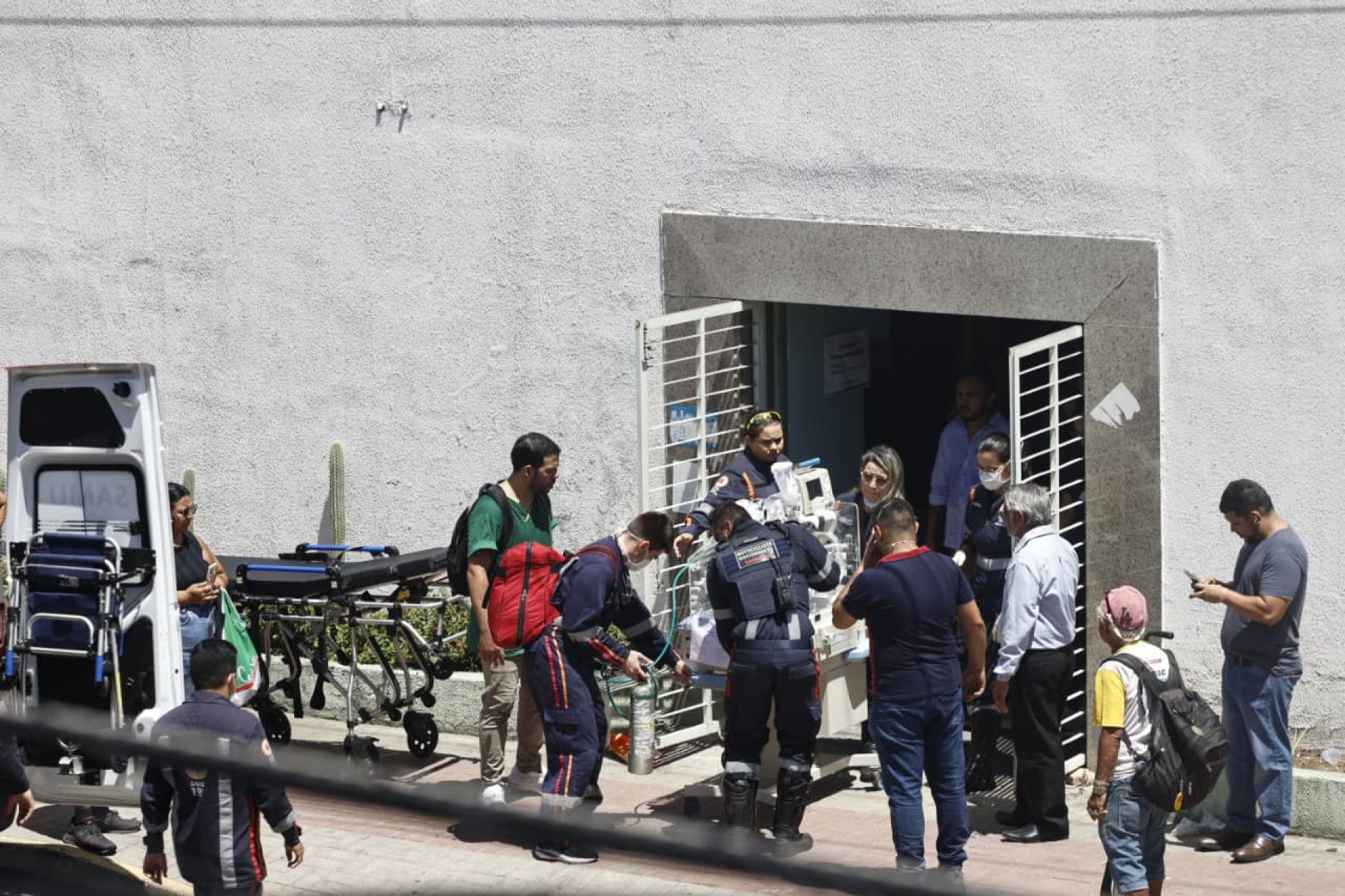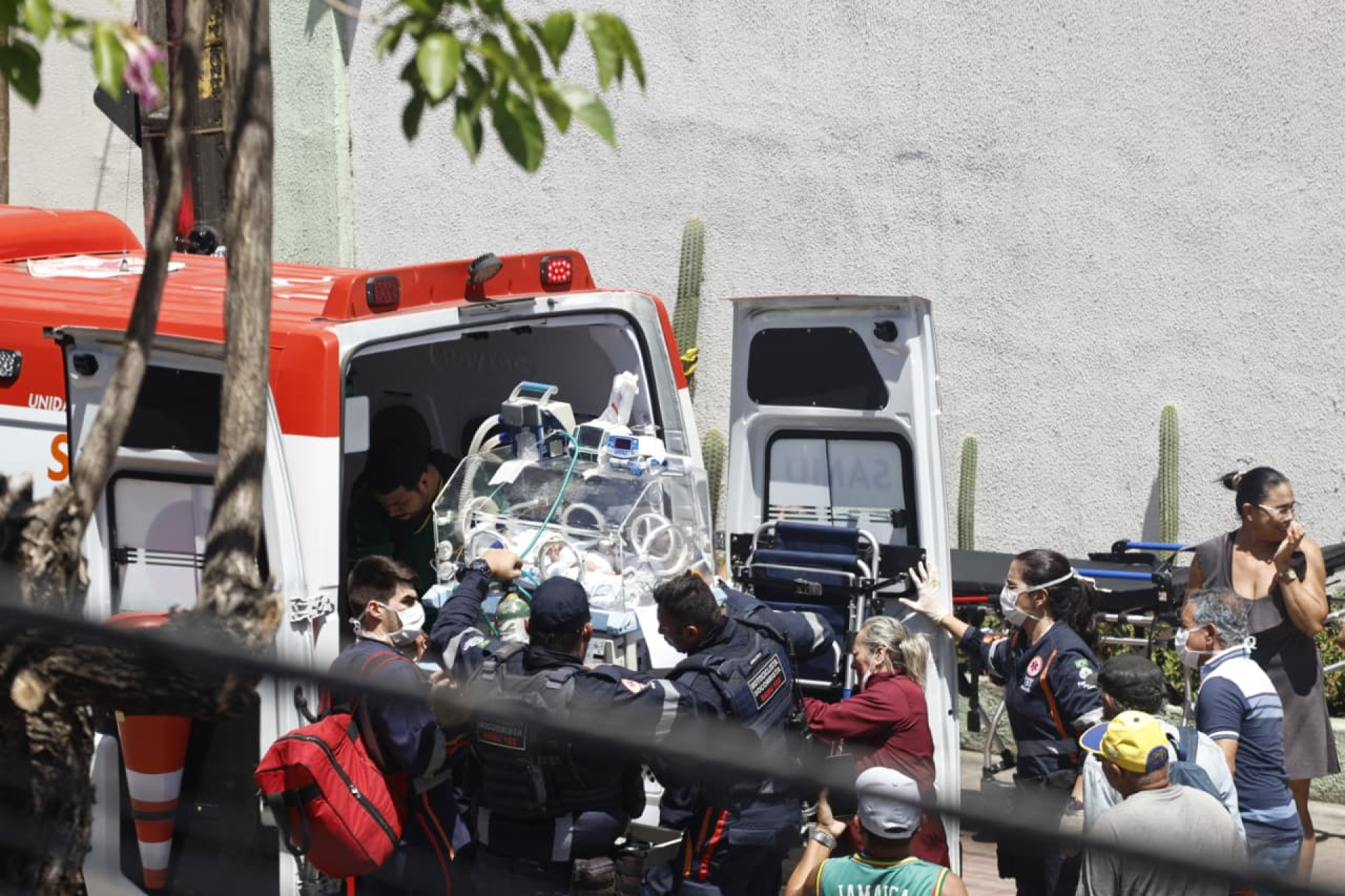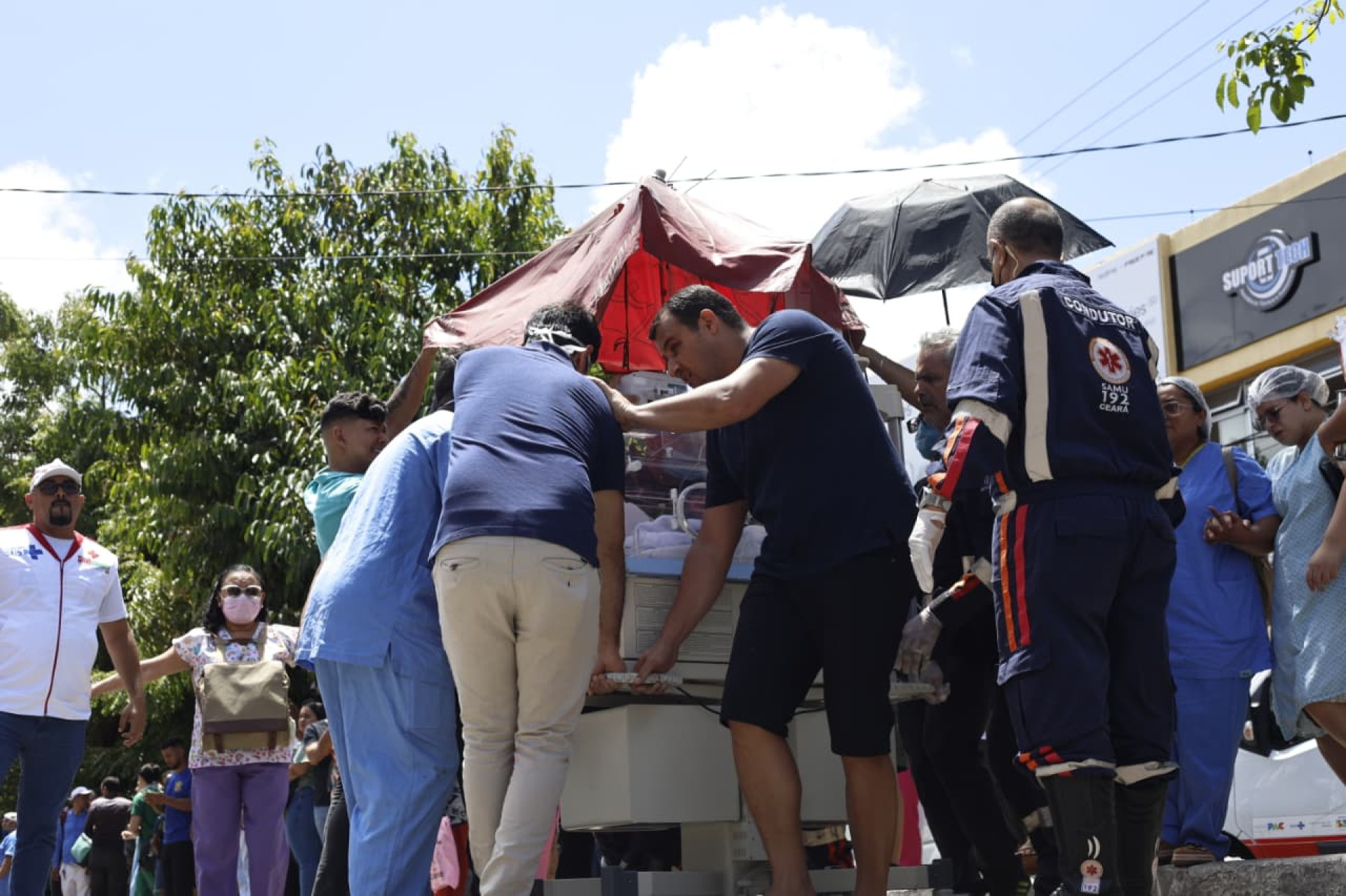 Dezenas de ambulâncias foram posicionadas na avenida Imperador, no Centro de Fortaleza, para levar os pacientes. Imagens mostram bebês em incubadoras e adultos sendo colocados nos veículos.