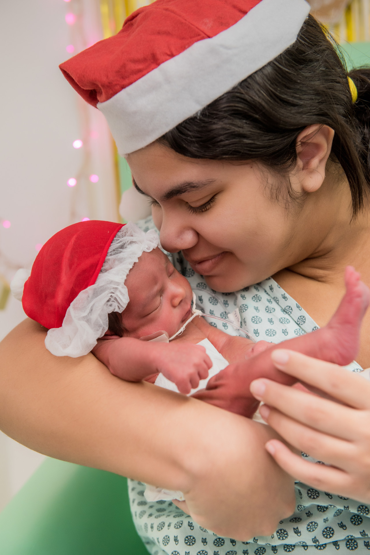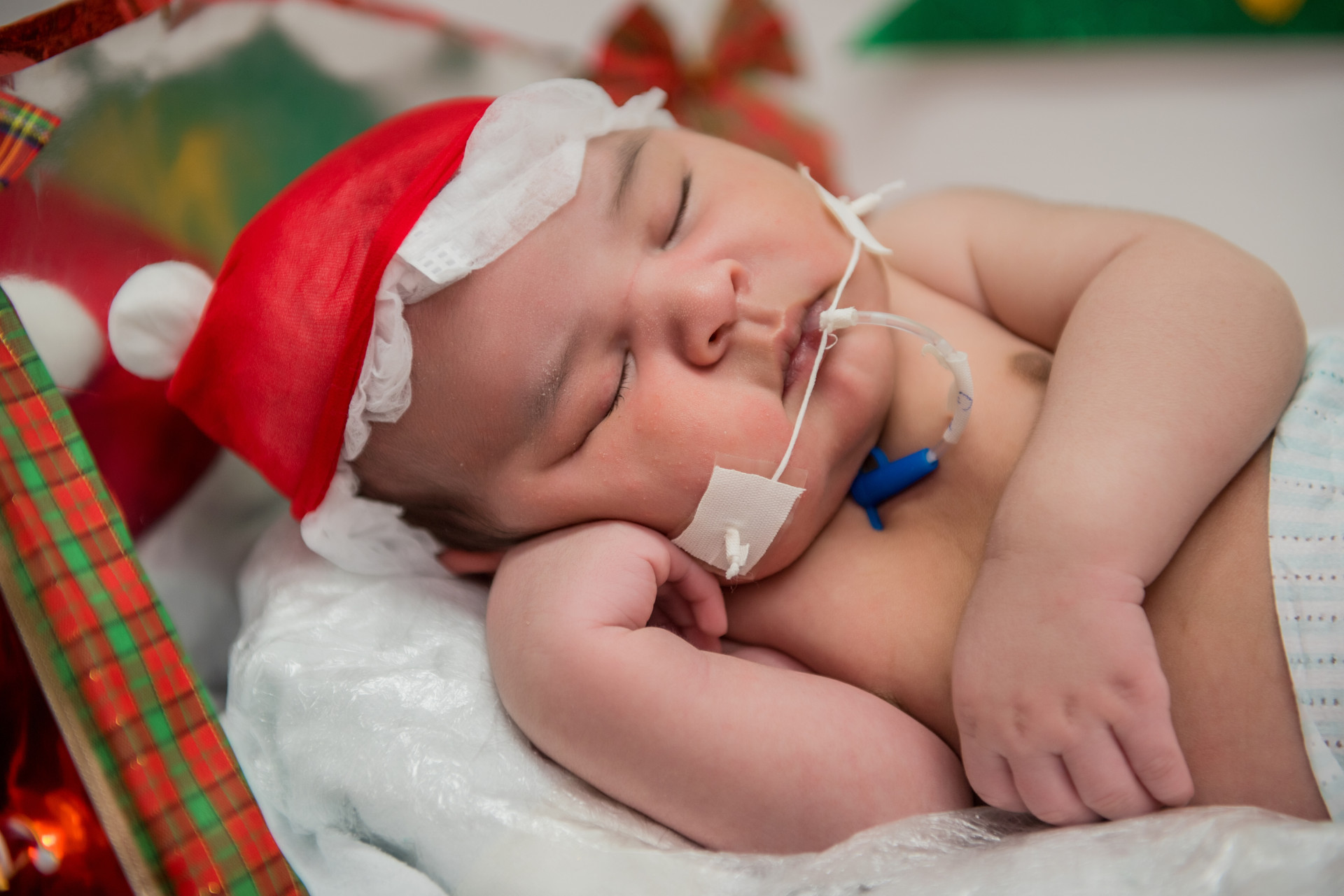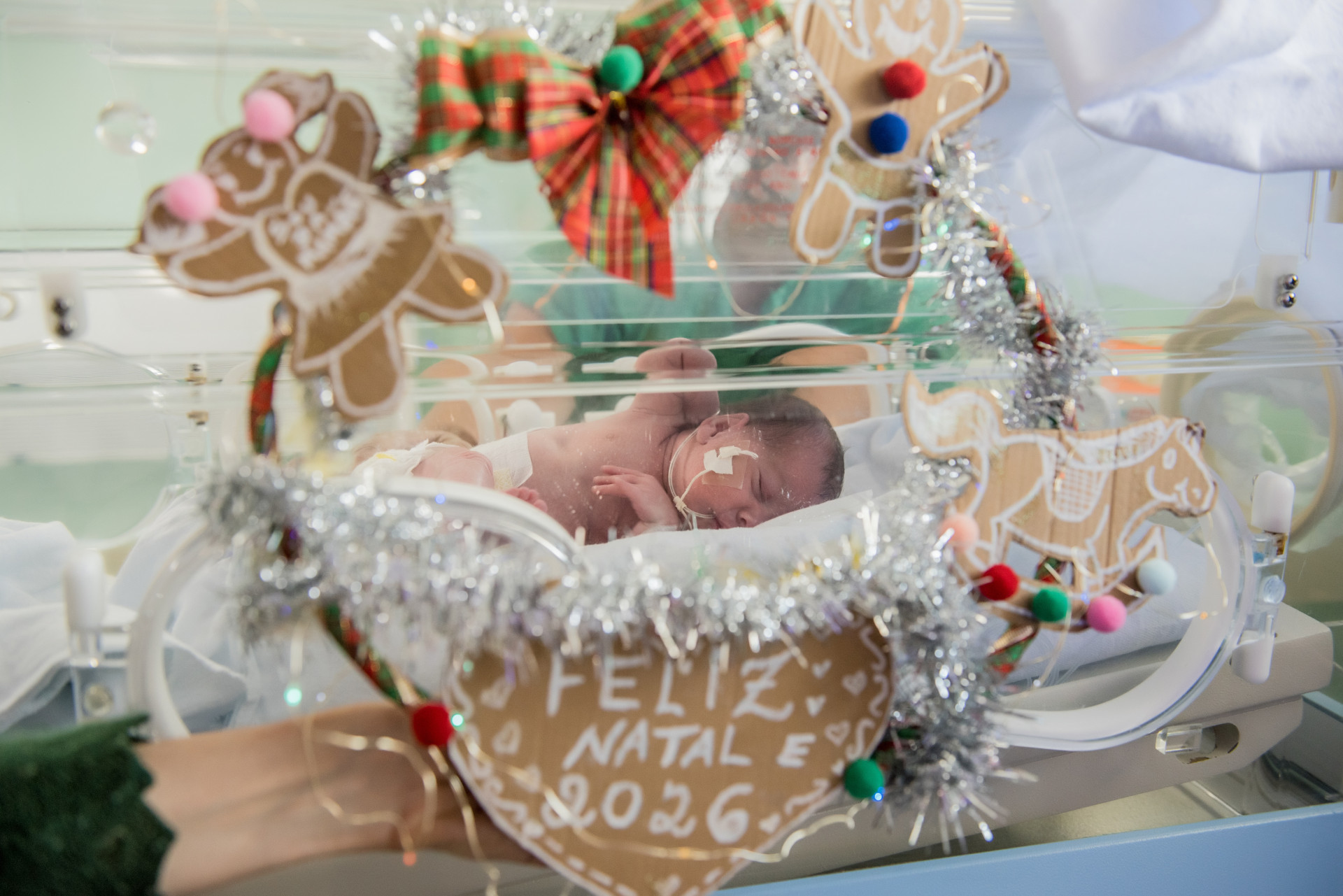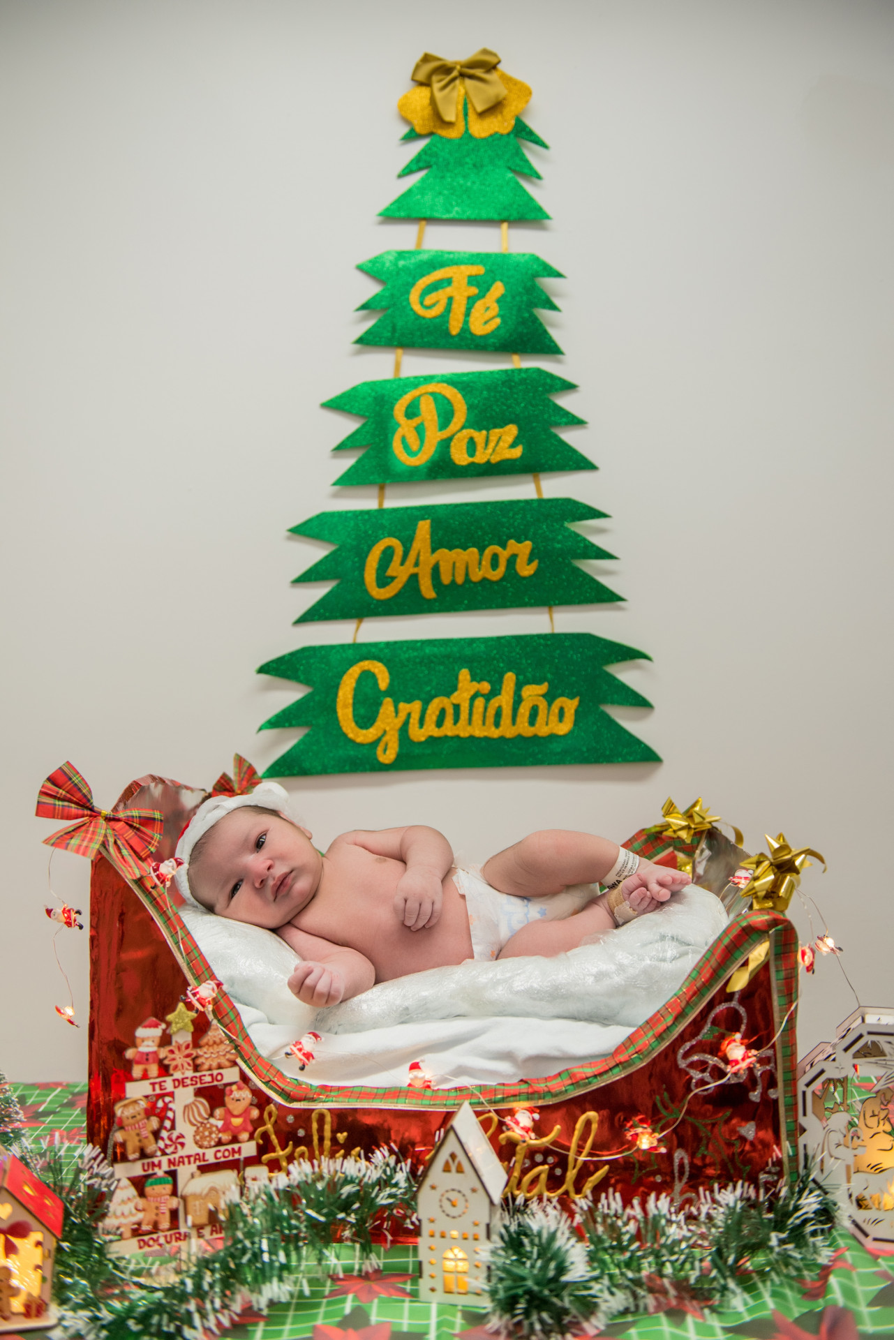 Vindo ao mundo com 34 semanas de gestação, João Miguel ganhou sua primeira sessão fotográfica aos 12 dias de vida. Sua mãe, a operadora de farmácia Ana Beatriz, destaca que esse é o primeiro Natal que os dois passam juntos. “Ele é meu primeiro filho. Com a foto, vamos eternizar esse momento. Espero ir pra casa com ele para passar o Natal”, conta.