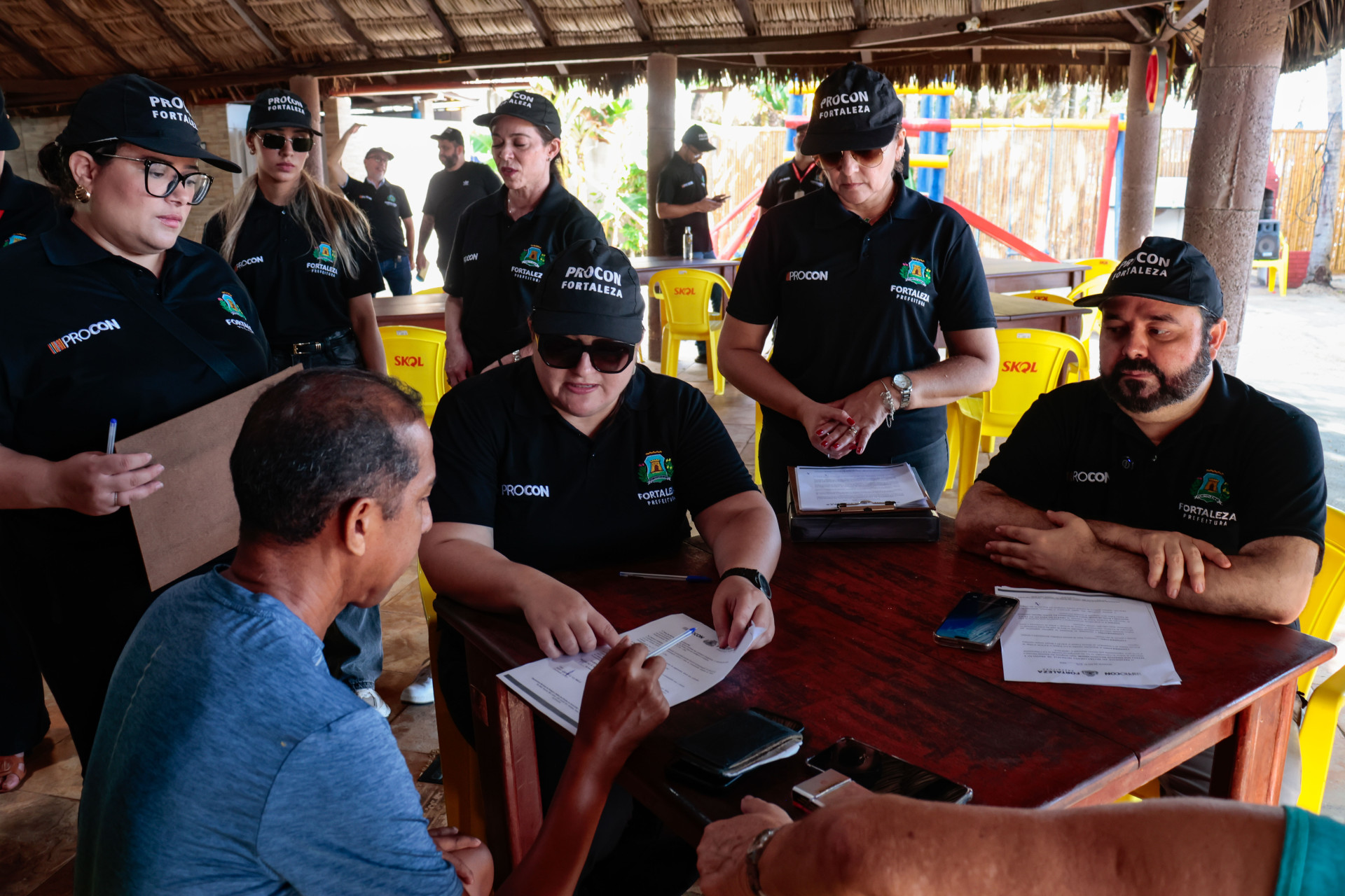 Cerca de 15 técnicos do Procon Fortaleza conversaram com representantes e clientes das barracas sobre a alteração injustificada de preços, notificação de cobranças por cadeiras e couvert artístico, gorjetas, intimidação de consumidores, entre outros pontos.