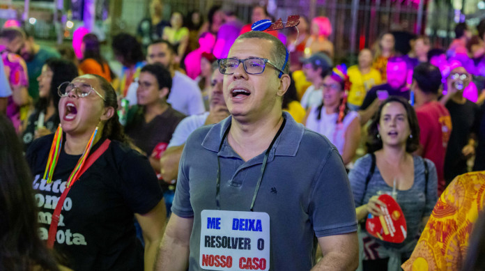 A aproximação das 20 horas fez o público continuar a se expandir. Passar entre os foliões é impossível sem um “com licença” murmurado instintivamente ou — na presença do som alto — gestos que possam representar o mesmo pedido.