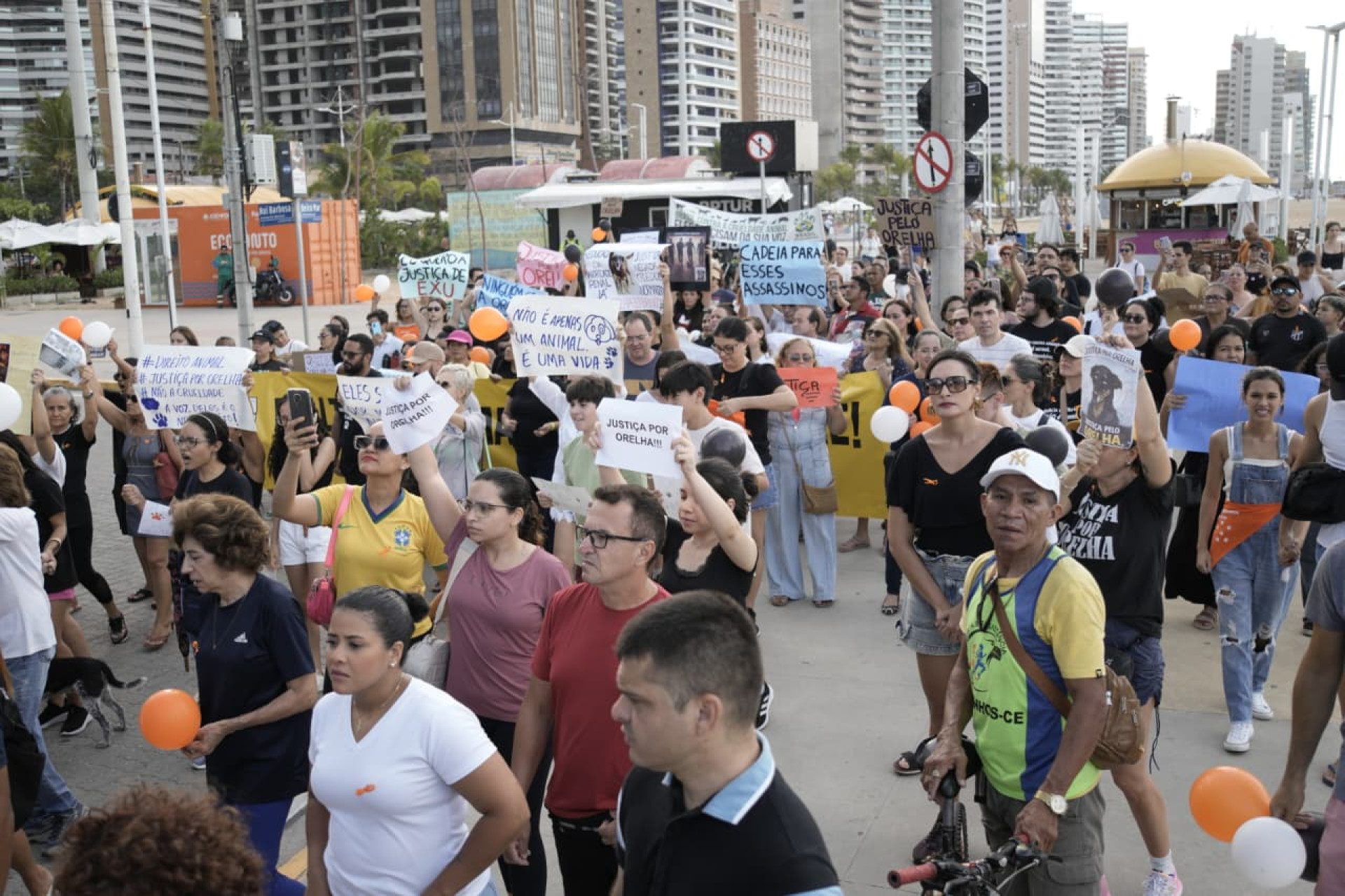Manifestantes se reuniram no Aterro da Praia de Iracema, em Fortaleza, neste domingo, 1° de fevereiro, para protestar por justiça pelo cão Orelha. O animal era conhecido como mascote comunitário da Praia Brava, em Santa Catarina (SC), e foi vítima de tortura por quatro adolescentes em Florianópolis, no dia 4 de janeiro. O ato começou por volta das 16 horas e percorreu as ruas até aproximadamente 17h30min.