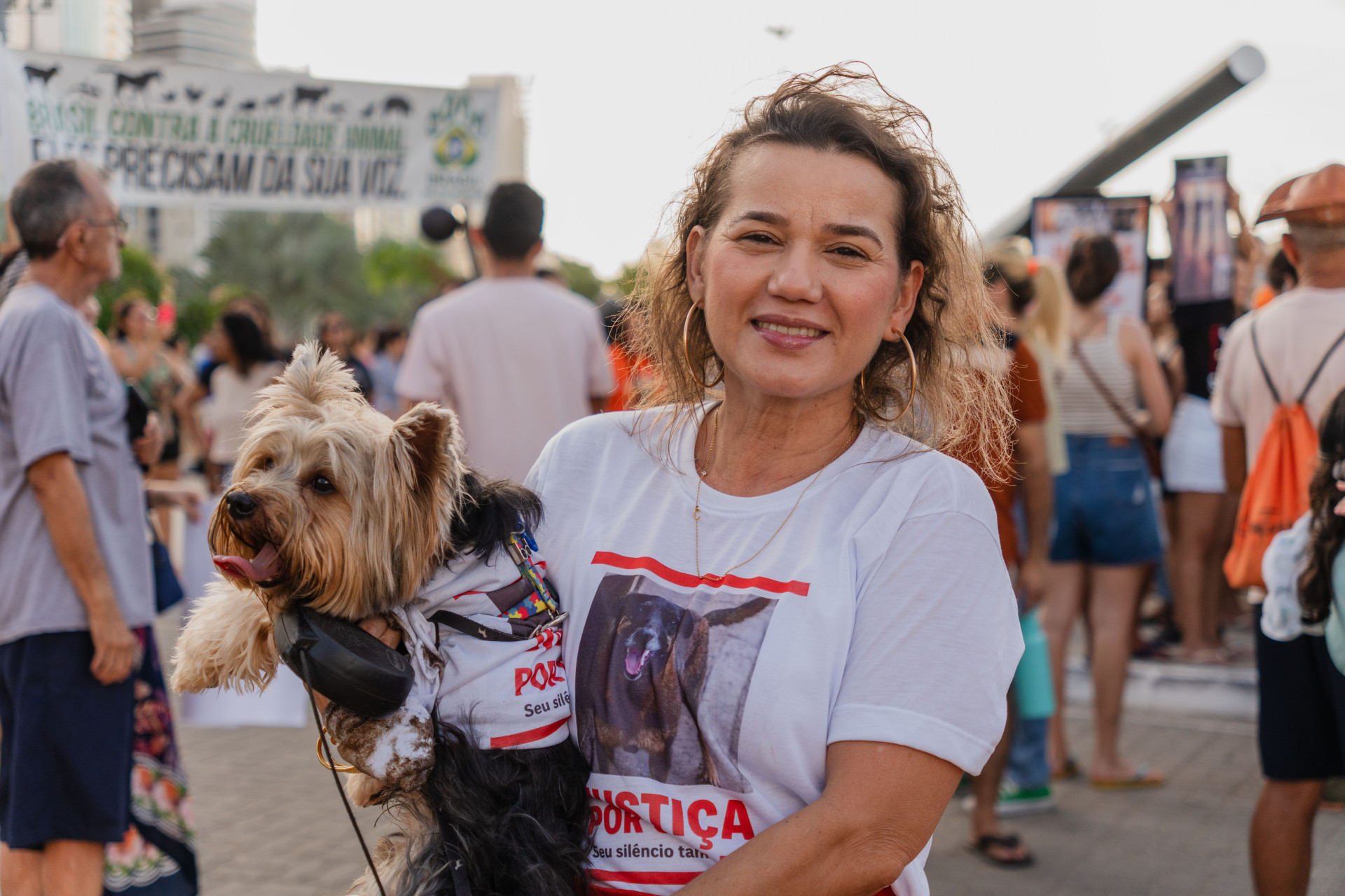 As duas foram acompanhadas também pelo cão Apolo, um dos cinco animais resgatados e acolhidos pela família. Apolo foi vítima de atropelamento e é um dos motivos que levaram mãe e filha ao protesto. "Eu achei ele e ele estava com a patinha esfacelada. Então, assim, eu luto muito por isso (...) Nós somos as vozes deles, e eu acho isso importantíssimo para a gente levar ao mundo por eles", ressalta Kátia.
