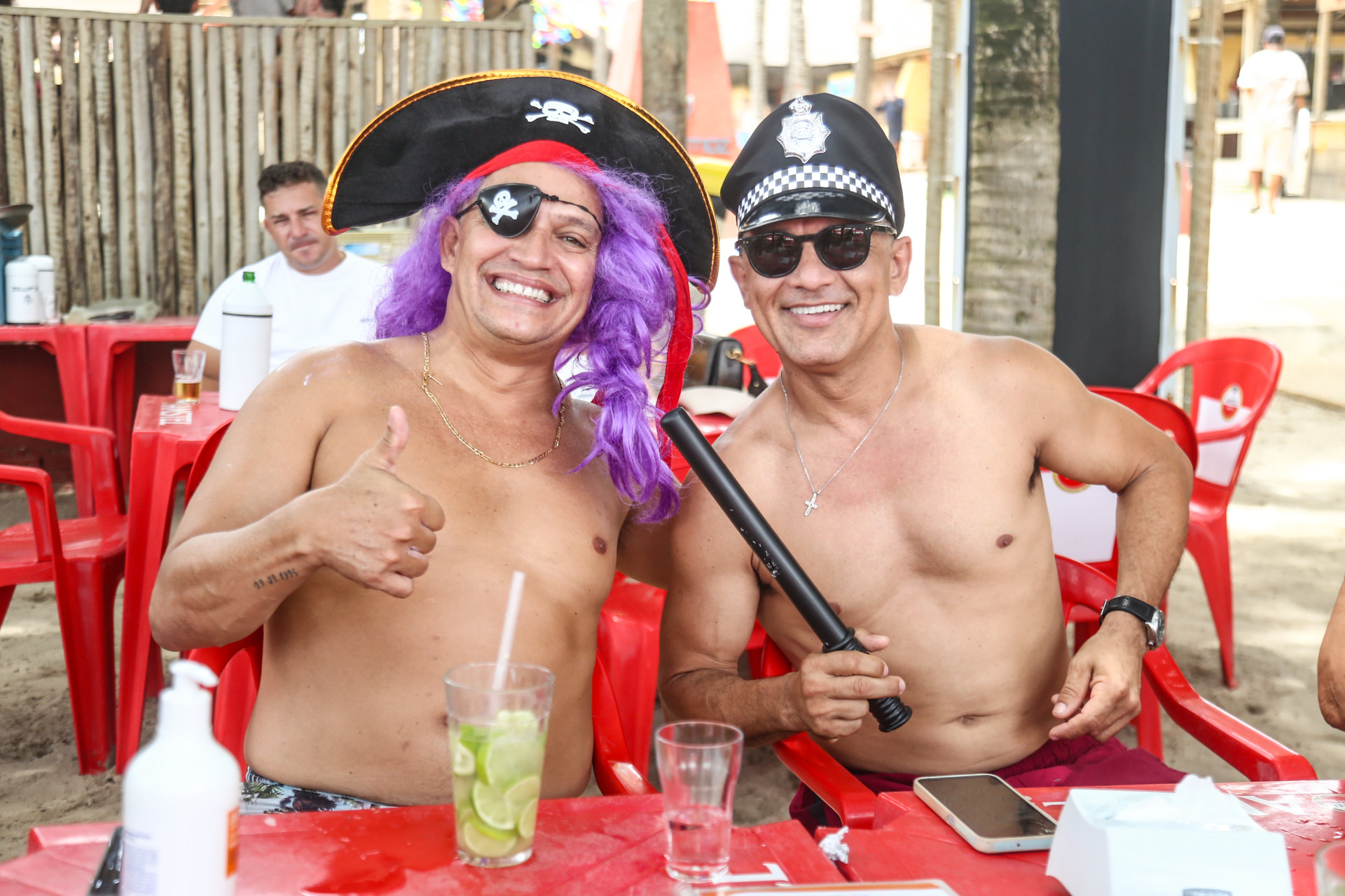 Destacando-se no ambiente pelos adereços de Carnaval, os irmãos Omar e James Holanda vieram caracterizados de pirata e policial, respectivamente.