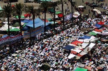 Sob um forte calor, milhares de pessoas reuniam-se desde a manhã na Praça Tahrir, agitando bandeiras egípcias, exibindo fotos de Mursi e gritando "Abaixo o Exército!".